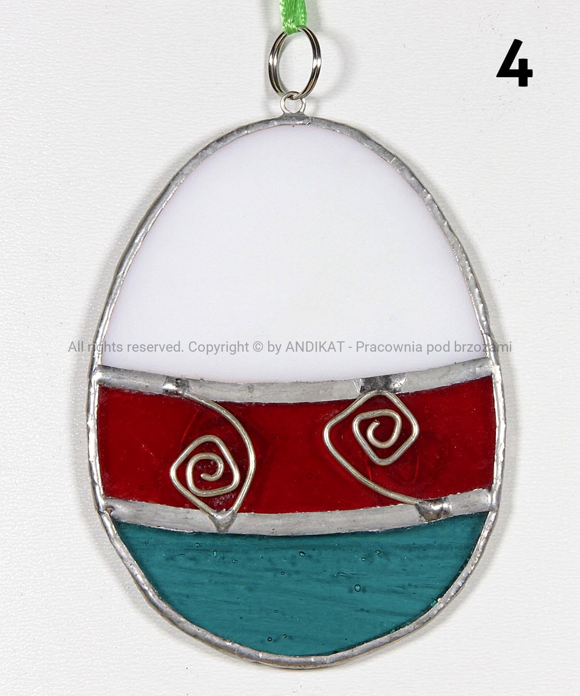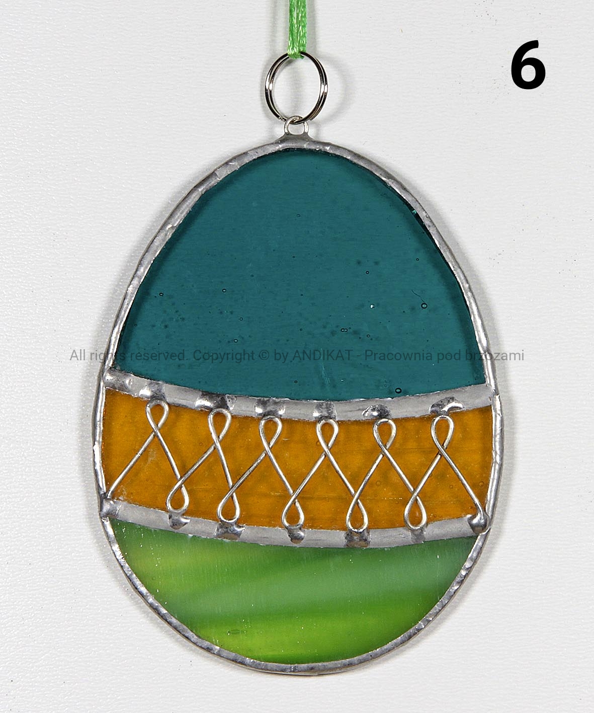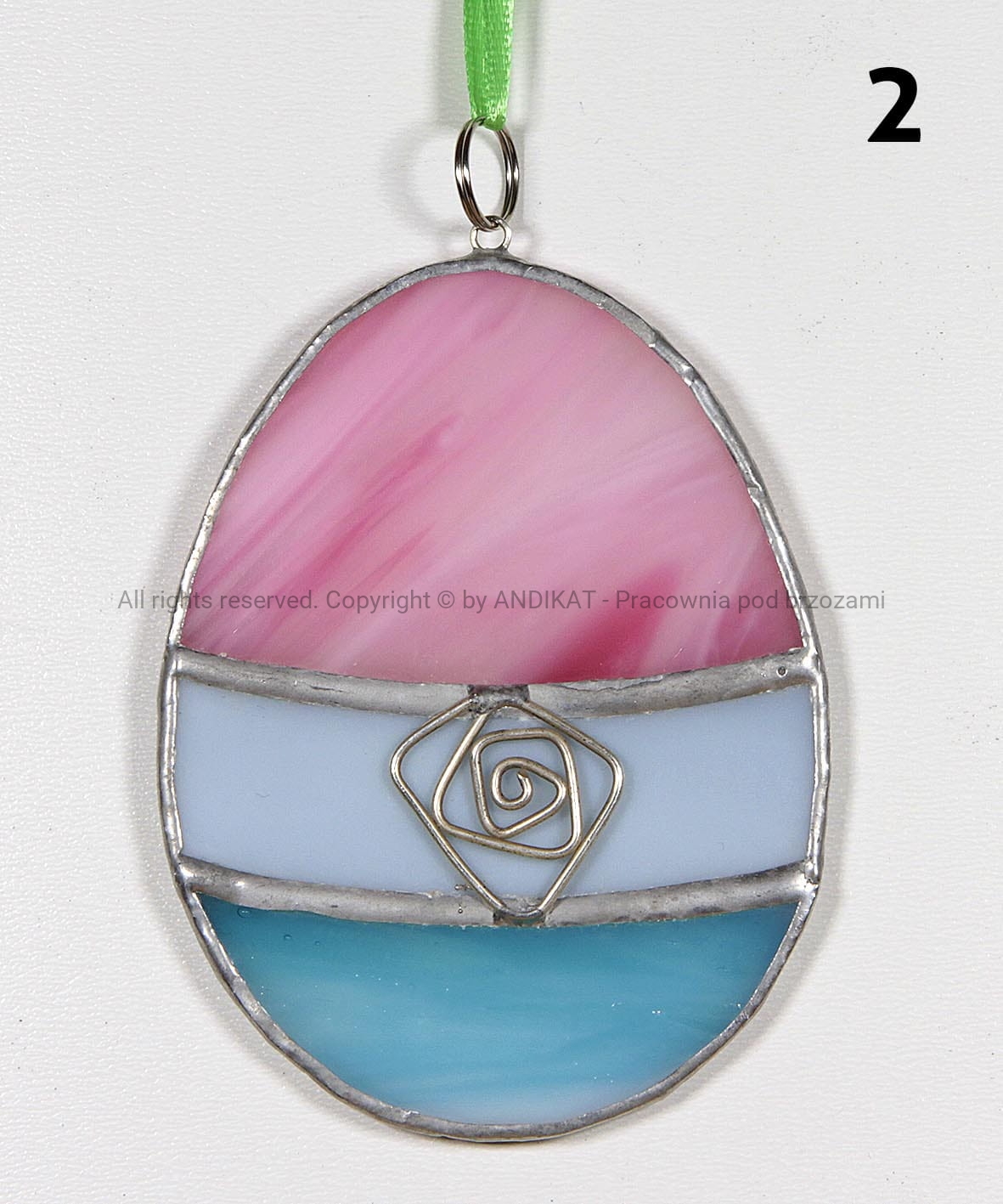 Pisanka Wielkanocna wykonana z opalowego szkła witrażowego w technice Tiffany. Świetnie się sprawdza jako dekoracja domu, szczególnie w okresie wielkanocnym. Może wisieć w oknie, przy lampie lub na wielkanocnym stroiku.
