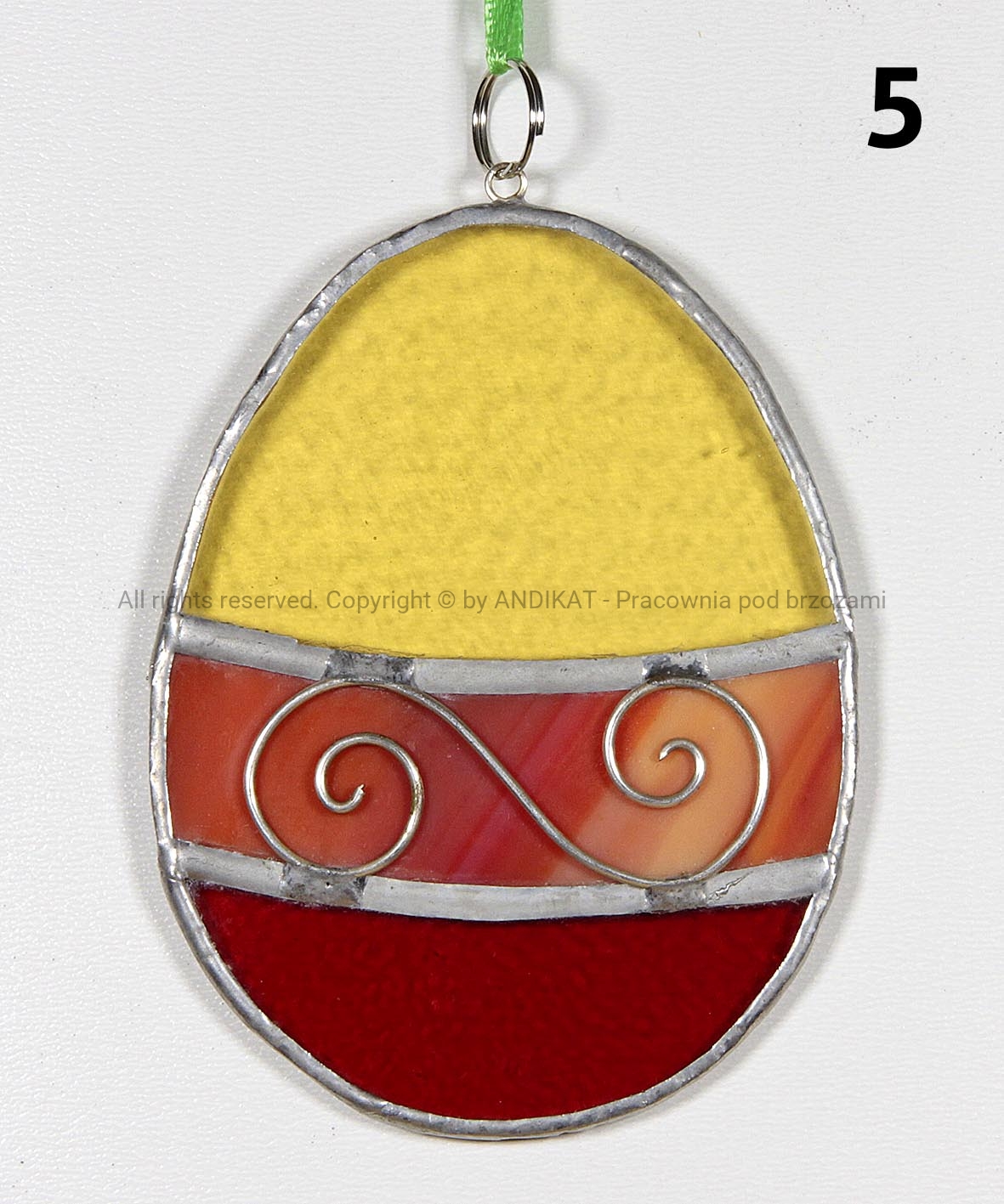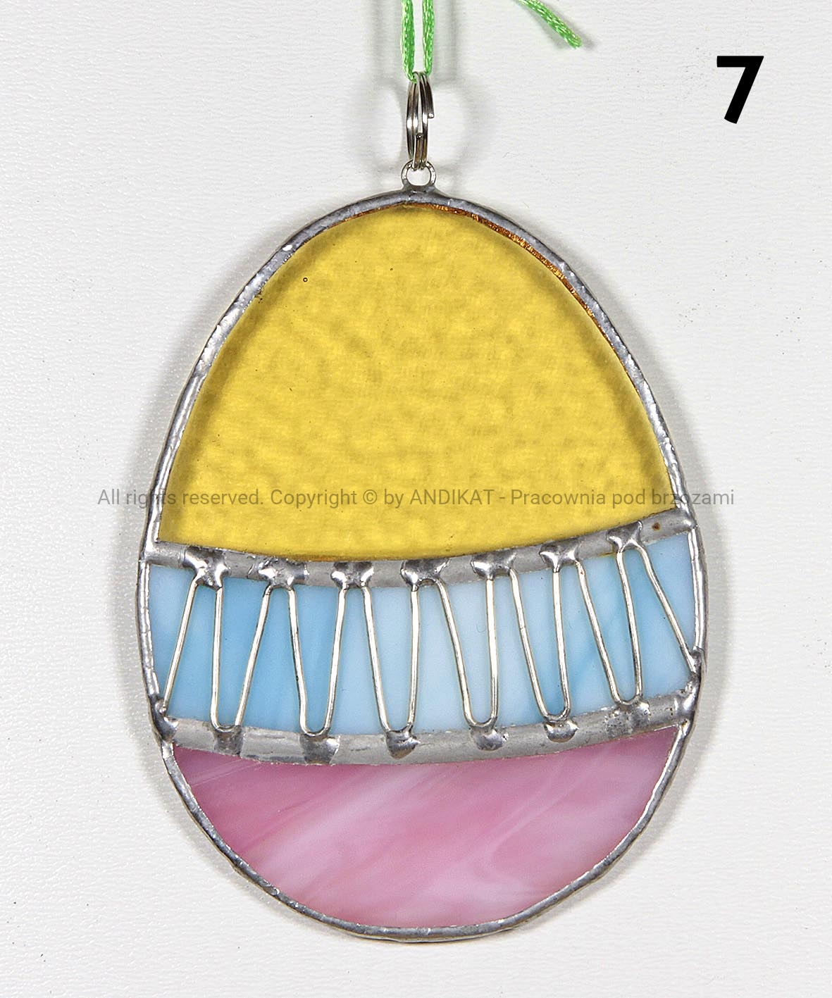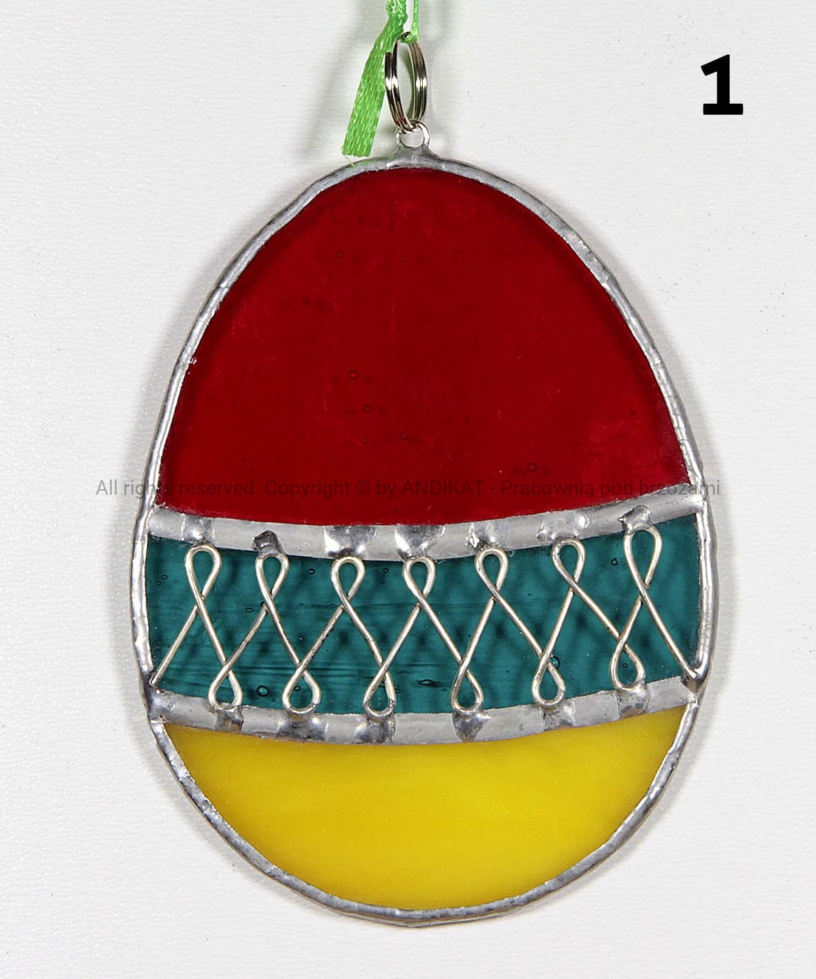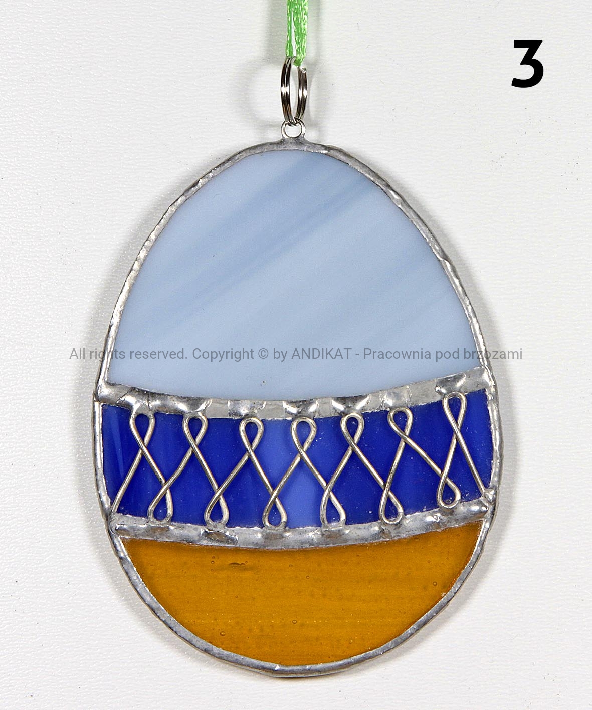 Pisanka Wielkanocna wykonana z opalowego szkła witrażowego w technice Tiffany. Świetnie się sprawdza jako dekoracja domu, szczególnie w okresie wielkanocnym. Może wisieć w oknie, przy lampie lub na wielkanocnym stroiku.