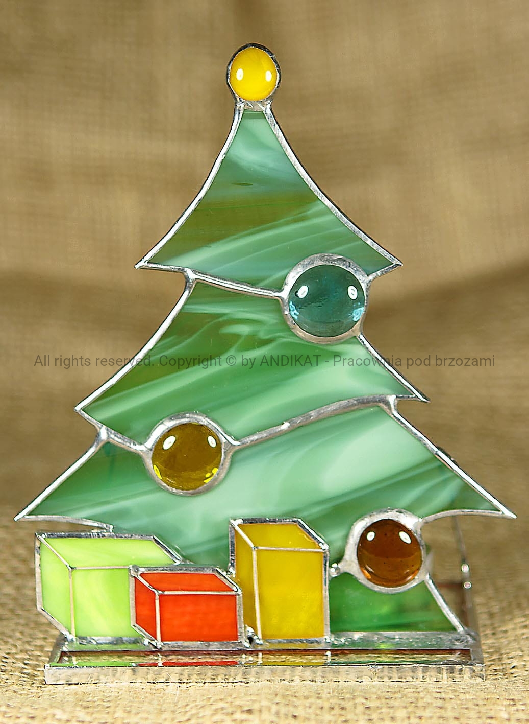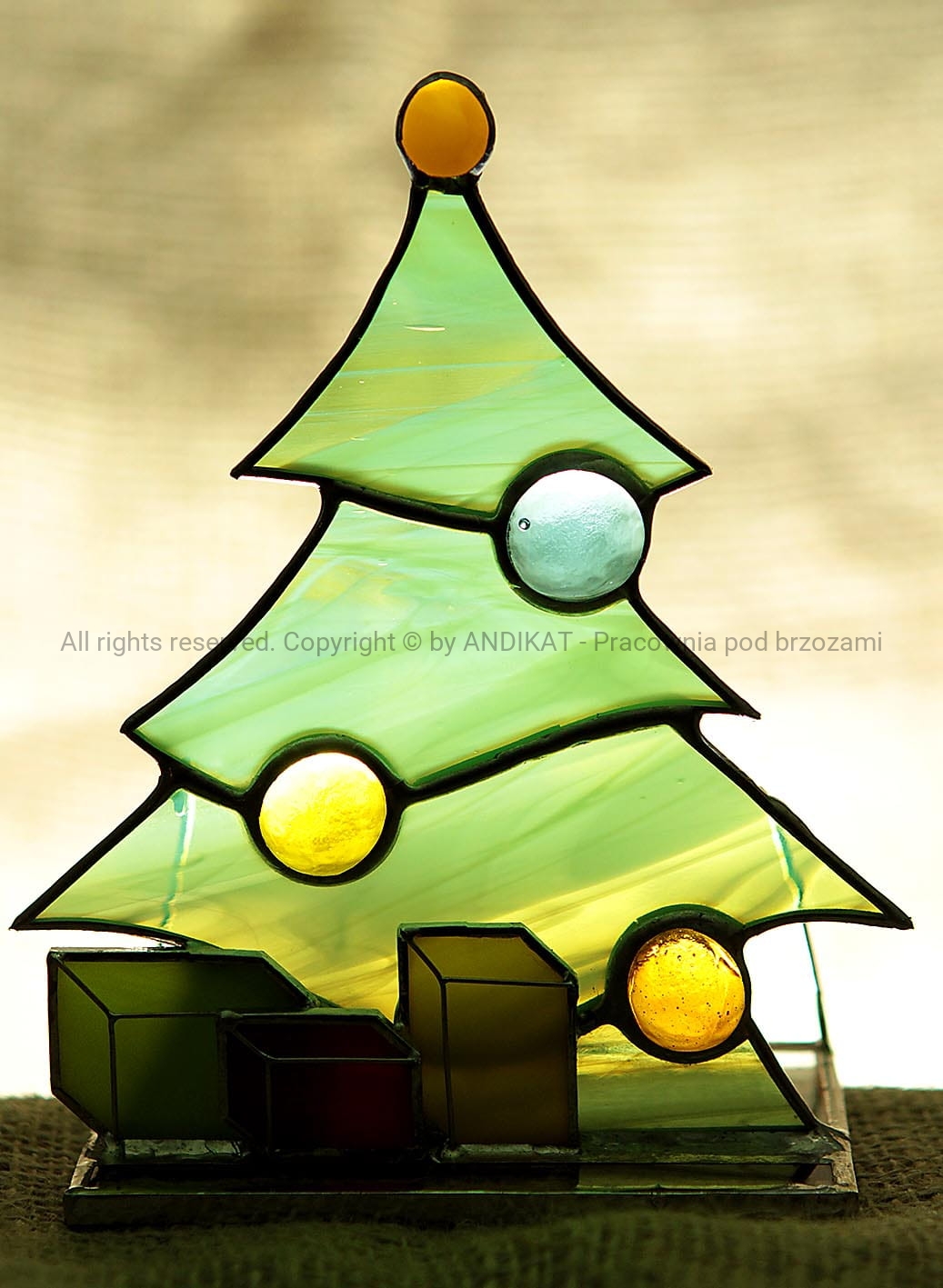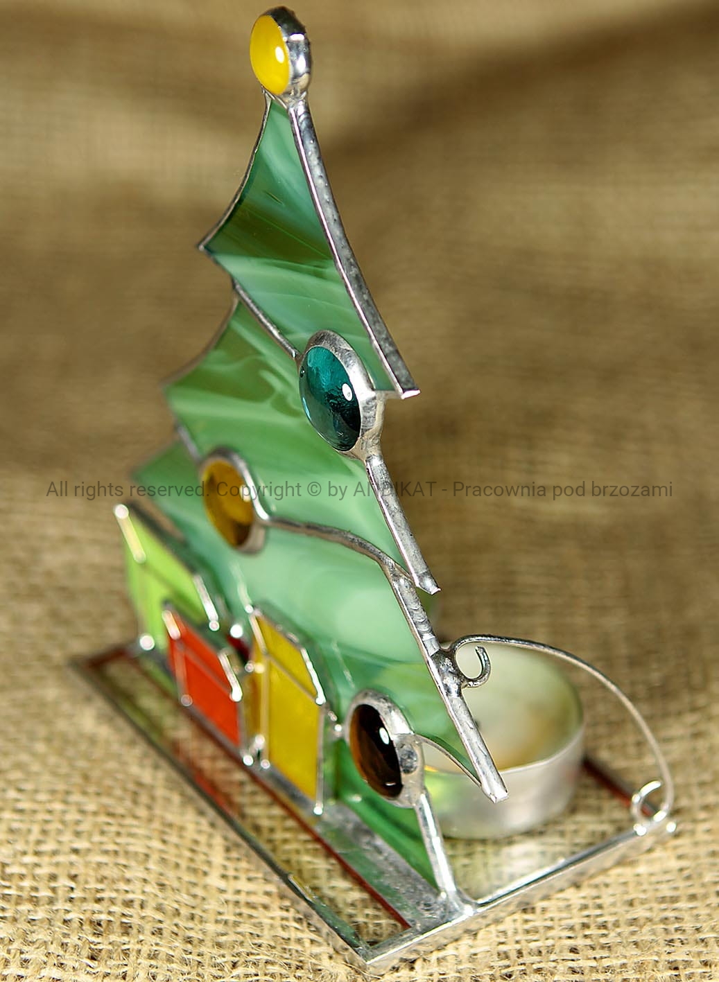 Lampion świąteczny wykonany w technice tiffany z opalowego szkła witrażowego. Dekoracja przydająca blasku świątecznym chwilom spędzonym w kręgu najbliższych. Pięknie i nastrojowo prezentuje się podświetlona płomieniem świeczki.