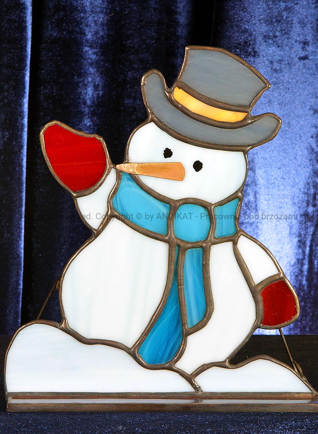Bałwanek na podstawce wykonany techniką tiffany ze szkła witrażowego opalowego. Sympatyczny grubasek od rana wprawiający w dobry humor. W pełnej krasie ukazuje się gdy go podświetlić. Nastrojowa i sympatyczna dekoracja na parapecie okna, na półce lub stole.