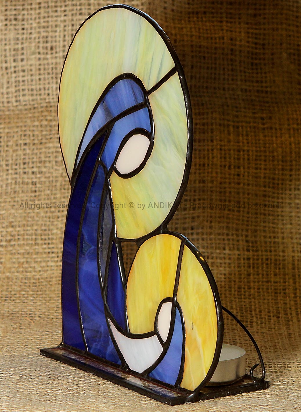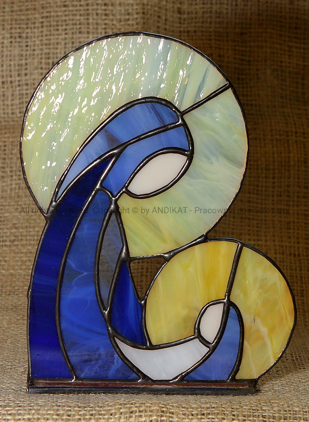 Postać na szklanej podstawce, wykonana techniką tiffany ze szkła witrażowego opalowego.