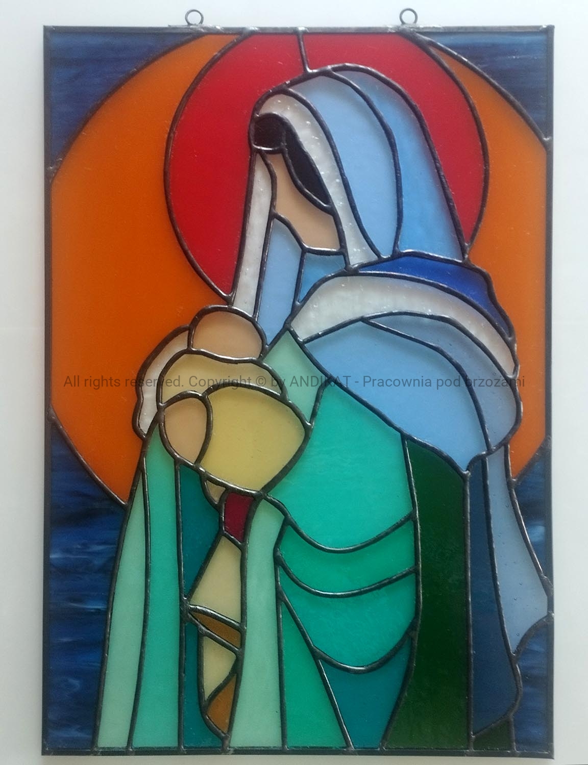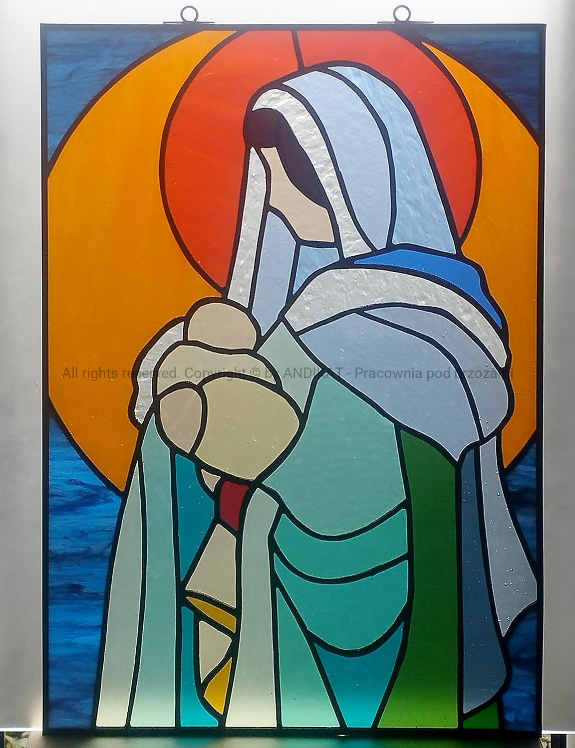 Witraż przedstawiający Matkę Bożą z Dzieciątkiem Jezus. Maryja, z czułością i troską zarazem przytula Boże Dziecię. Witraż pięknie świeci kolorami zawieszony w oknie. Równie pięknie prezentuje się na jasnej ścianie.
