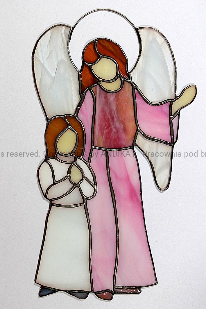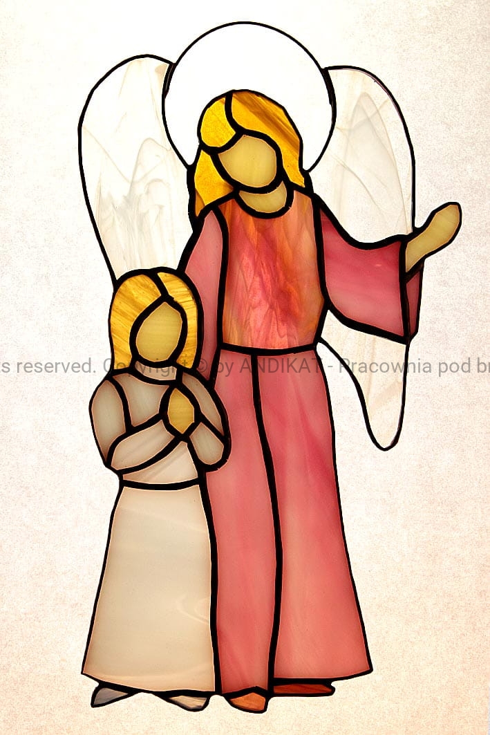 Anioł Stróż jest opiekunem ludzi na ziemi. Od początku towarzyszy Ci w codziennej wędrówce, czuwa nad Tobą nocą. Może często o Nim nie pamiętasz. Może dlatego nie zdajesz sobie sprawy jak wiele Mu zawdzięczasz. Taki witraż na oknie przypomni Ci o Nim... i ładnie rozświetli pokój.