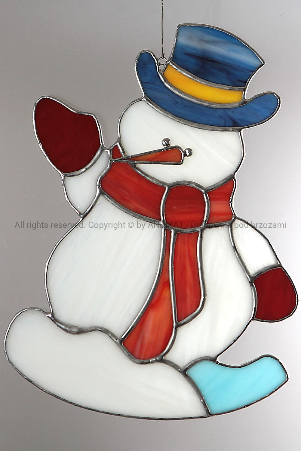 Bałwanek wykonany techniką tiffany ze szkła witrażowego opalowego.