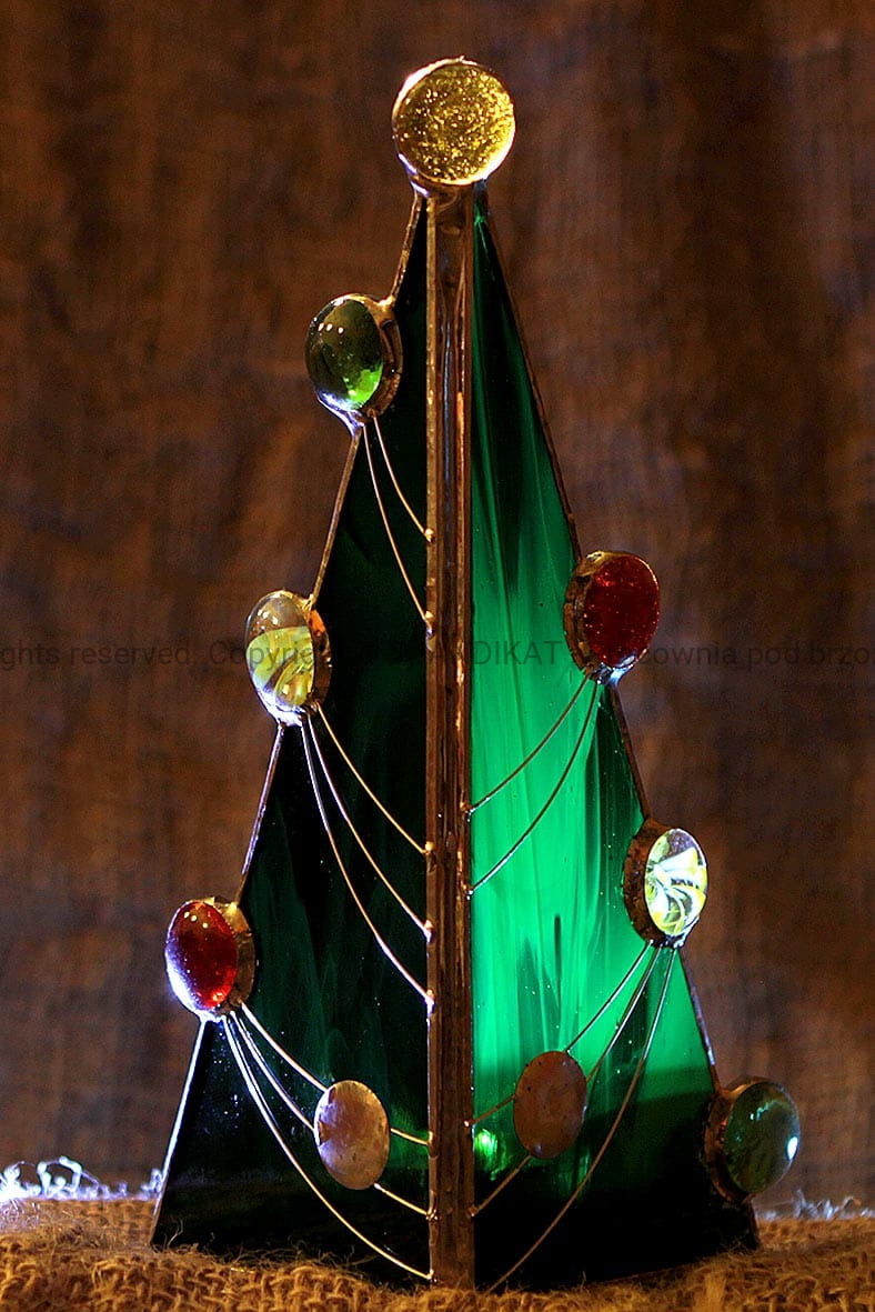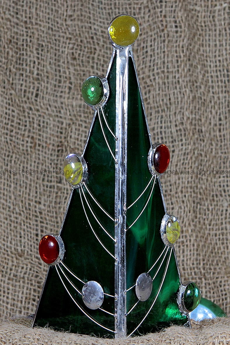 Choinka wykonana techniką tiffany ze szkła witrażowego opalowego. Ozdobiona kamykami ze szkła i girlandami z posrebrzanego drutu. W pełnej krasie ukazuje się podświetlona świeczką.