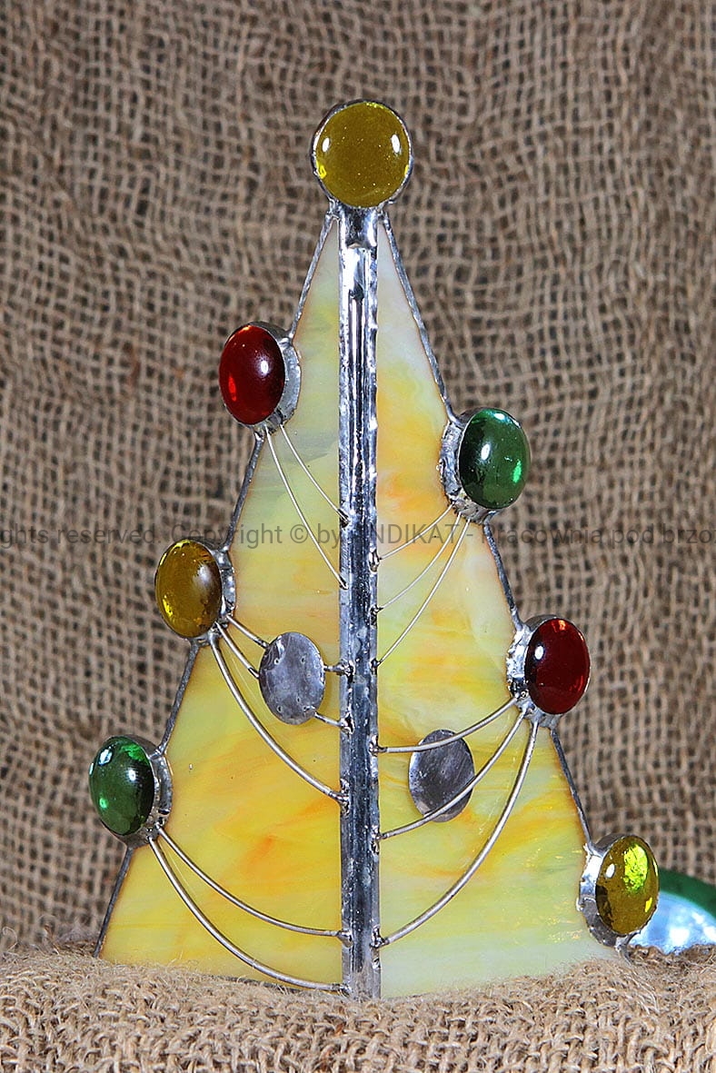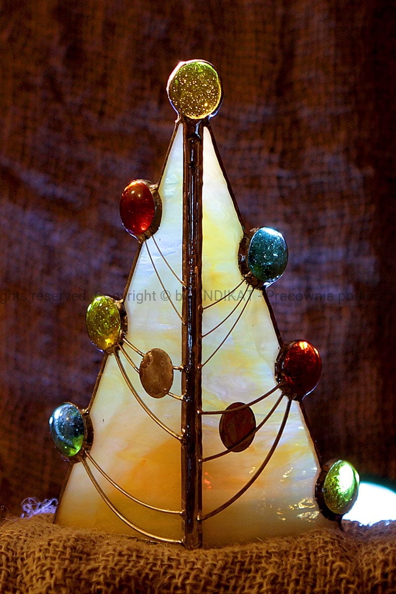 Choinka wykonana techniką tiffany ze szkła witrażowego opalowego. Ozdobiona kamykami ze szkła i girlandami z posrebrzanego drutu. W pełnej krasie ukazuje się podświetlona świeczką. Bardzo nastrojowy element ozdobny w domu.