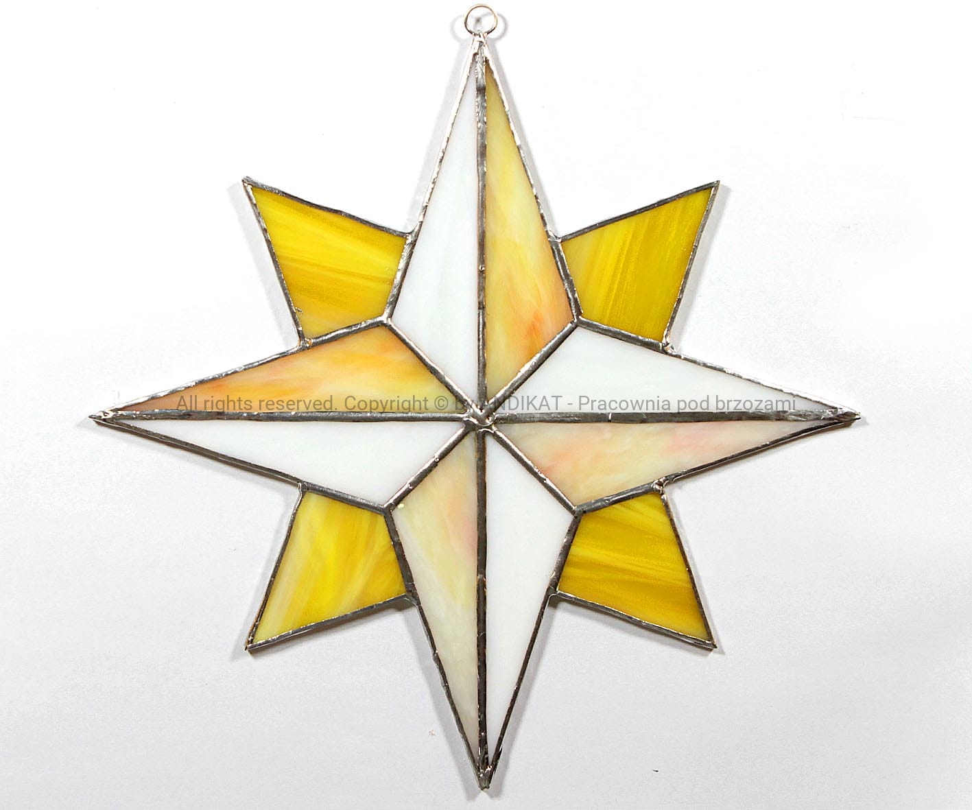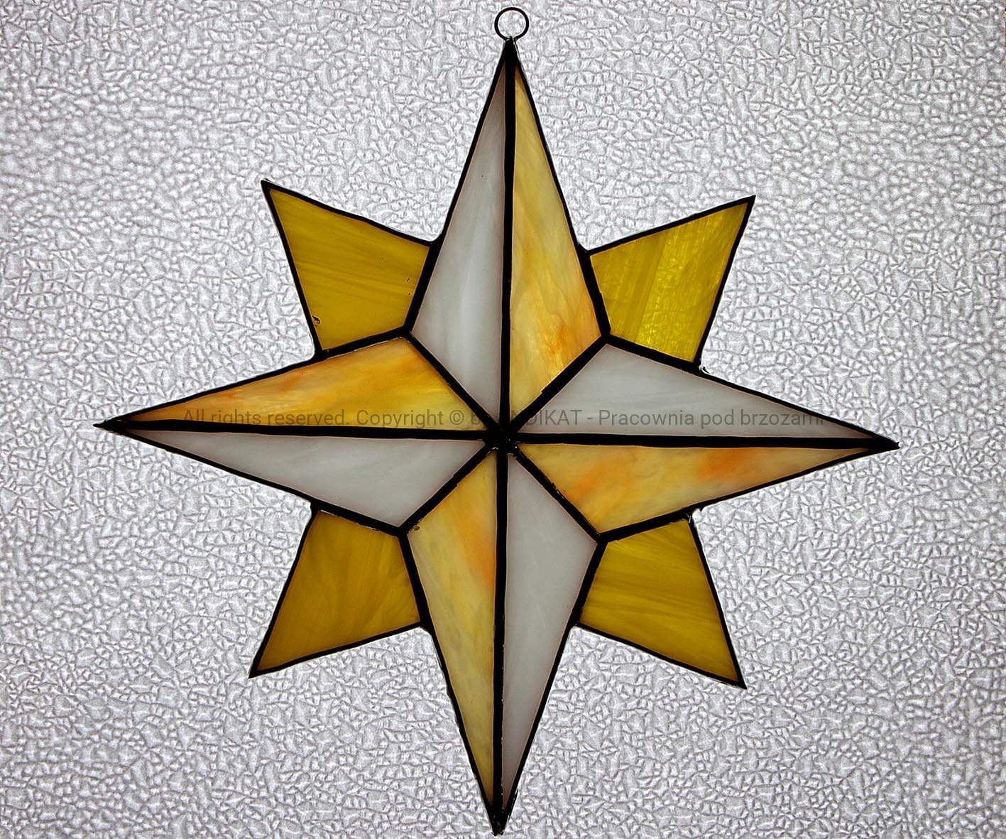 Gwiazda betlejemska wykonana w technice tiffany z opalowego szkła witrażowego. Pięknie prezentuje się zawieszona w oknie.