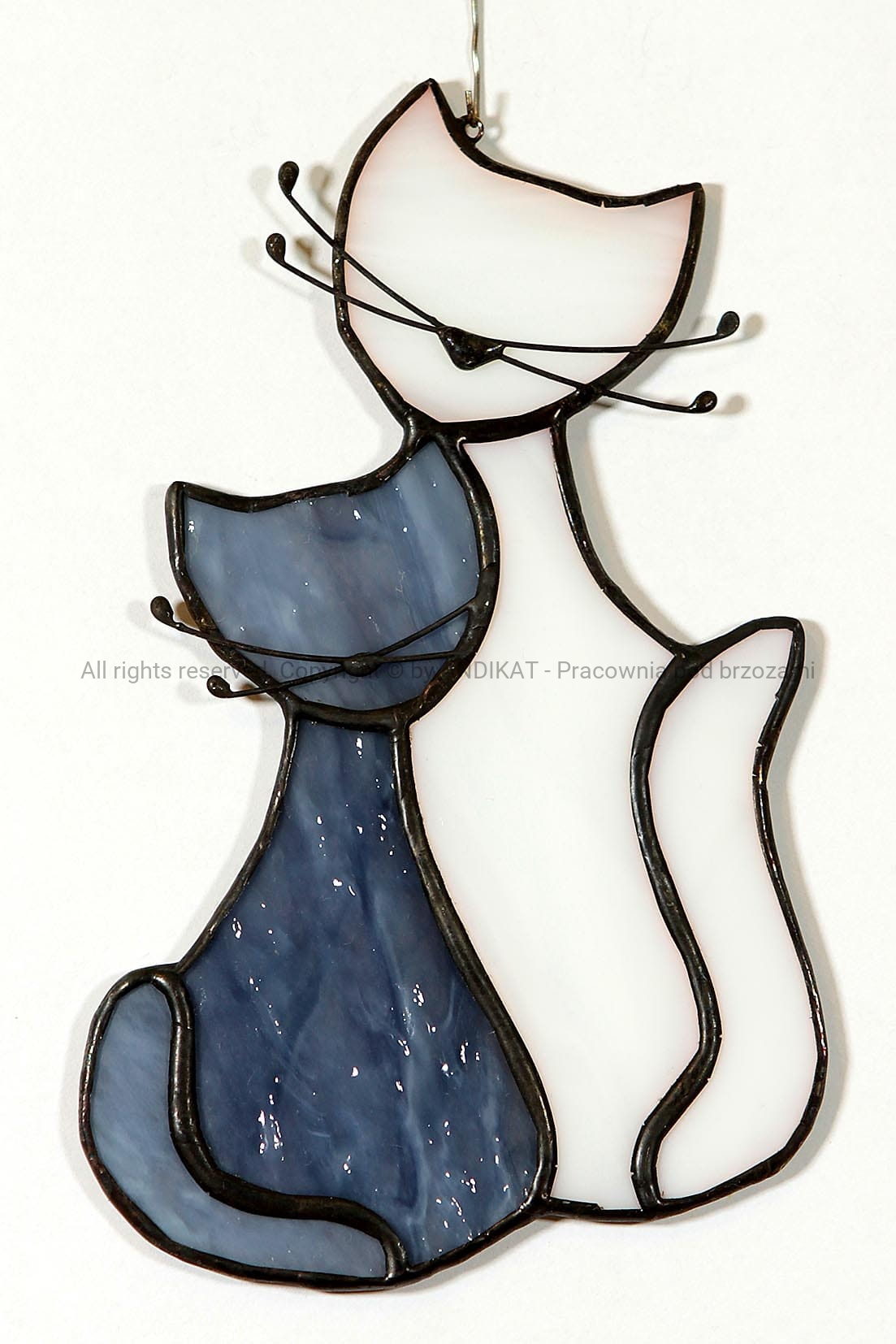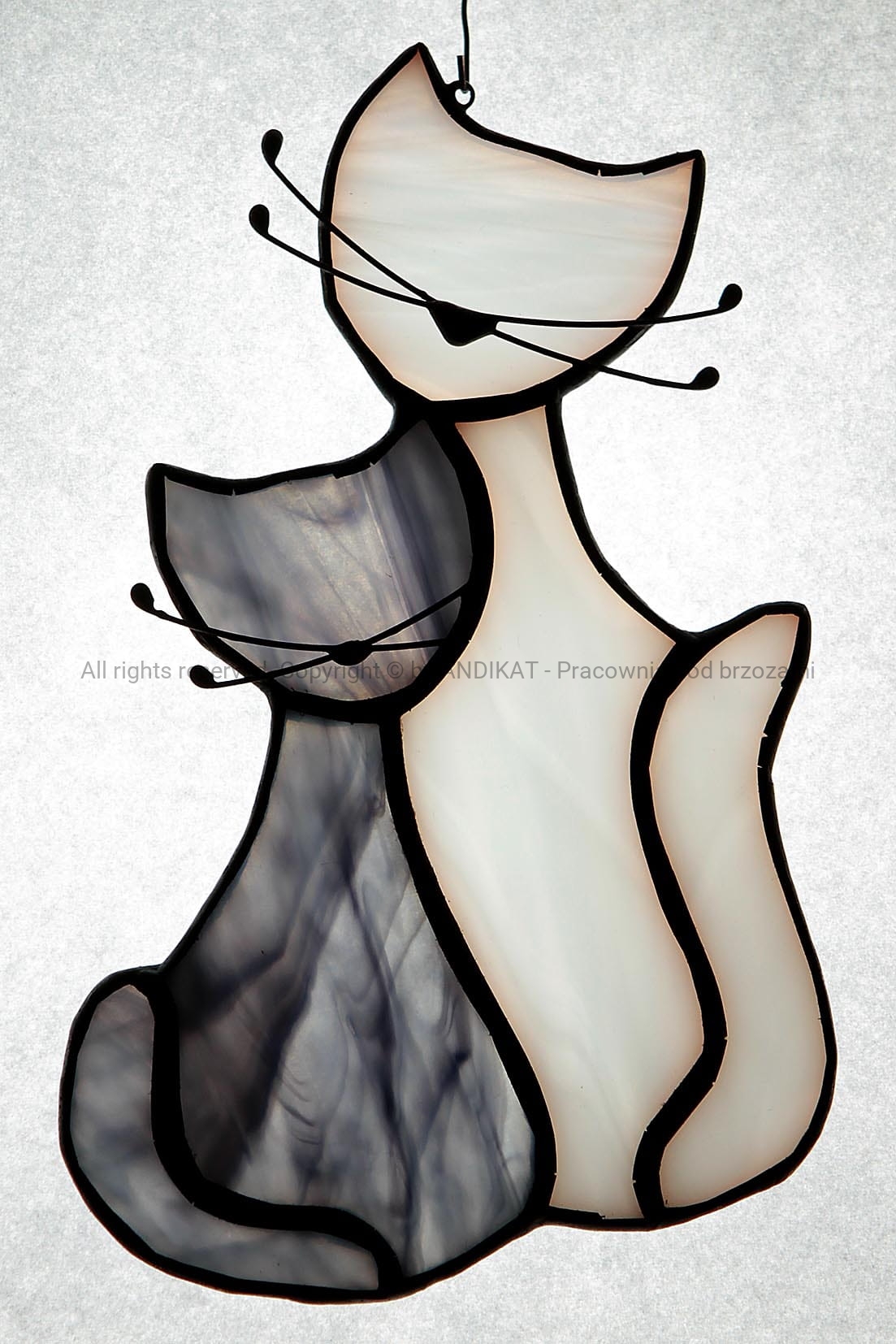 Ta, czule tuląca się para kotów, doda barwy wnętrzu, gdy zawieszony w oknie, uchwyci promyk światła.