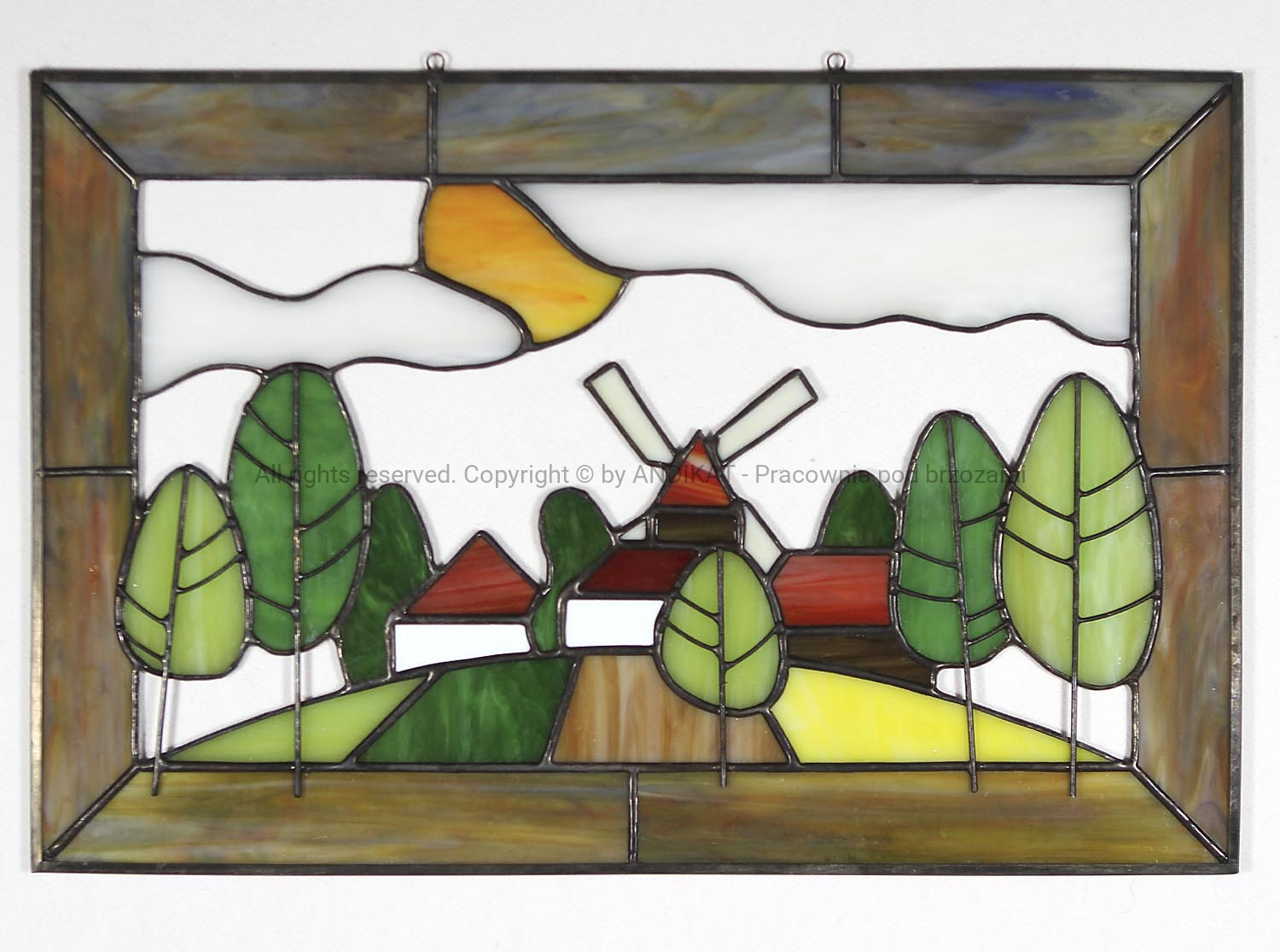 Wspomnienie lata na wsi, z dala od zgiełku spraw codziennych... Mile spędzone chwile zawsze warto utrwalić na dłużej. Ten witraż ma przywołać dobre emocje i wspomnienia. A może przypominać o marzeniach, które warto spełniać. Witraż wykonany ze szkła witrażowego opalowego. Pięknie lśni kolorem w oknie oświetlonym słońcem. Równie wspaniale prezentuje się na ścianie. Na zamówienie można uzgodnić kolorystykę szkła.