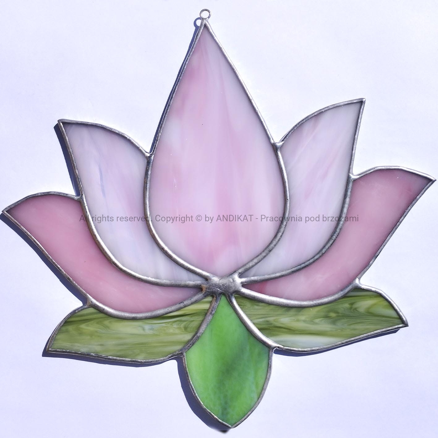 Kwiat lotosu wiąże się z kulturą i religiami Dalekiego Wschodu. Jest symbolem boskości, długo wieczności, harmonii, oświecenia, odrodzenia i niewinności. Ten uroczy kwiat doda barwy wnętrzu, gdy zawieszona w oknie, uchwyci promyki słońca. Witraż wykonany w technice Tiffany ze szkła opalowego.