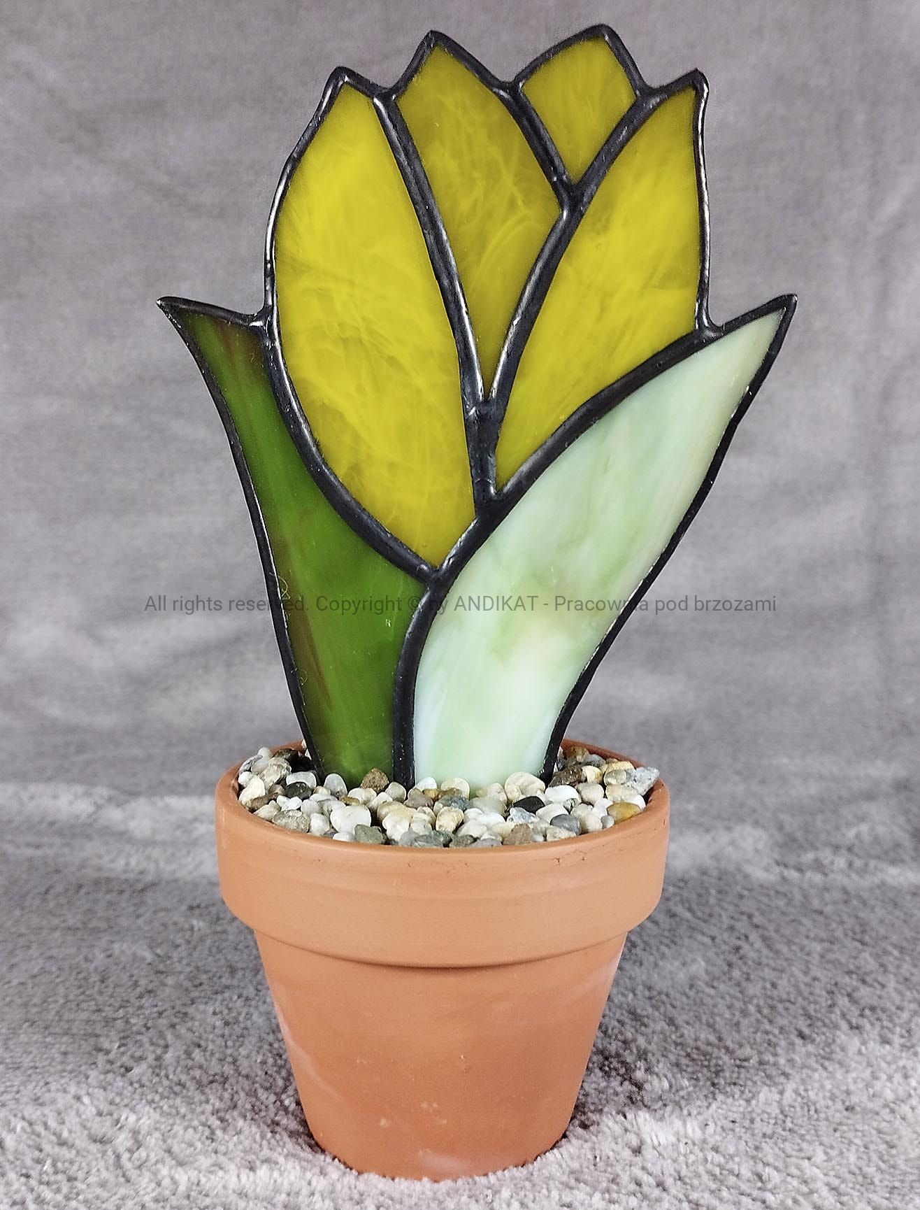 Materiał Szkło witrażowe, cyna, ceramiczna doniczka, żwirek
