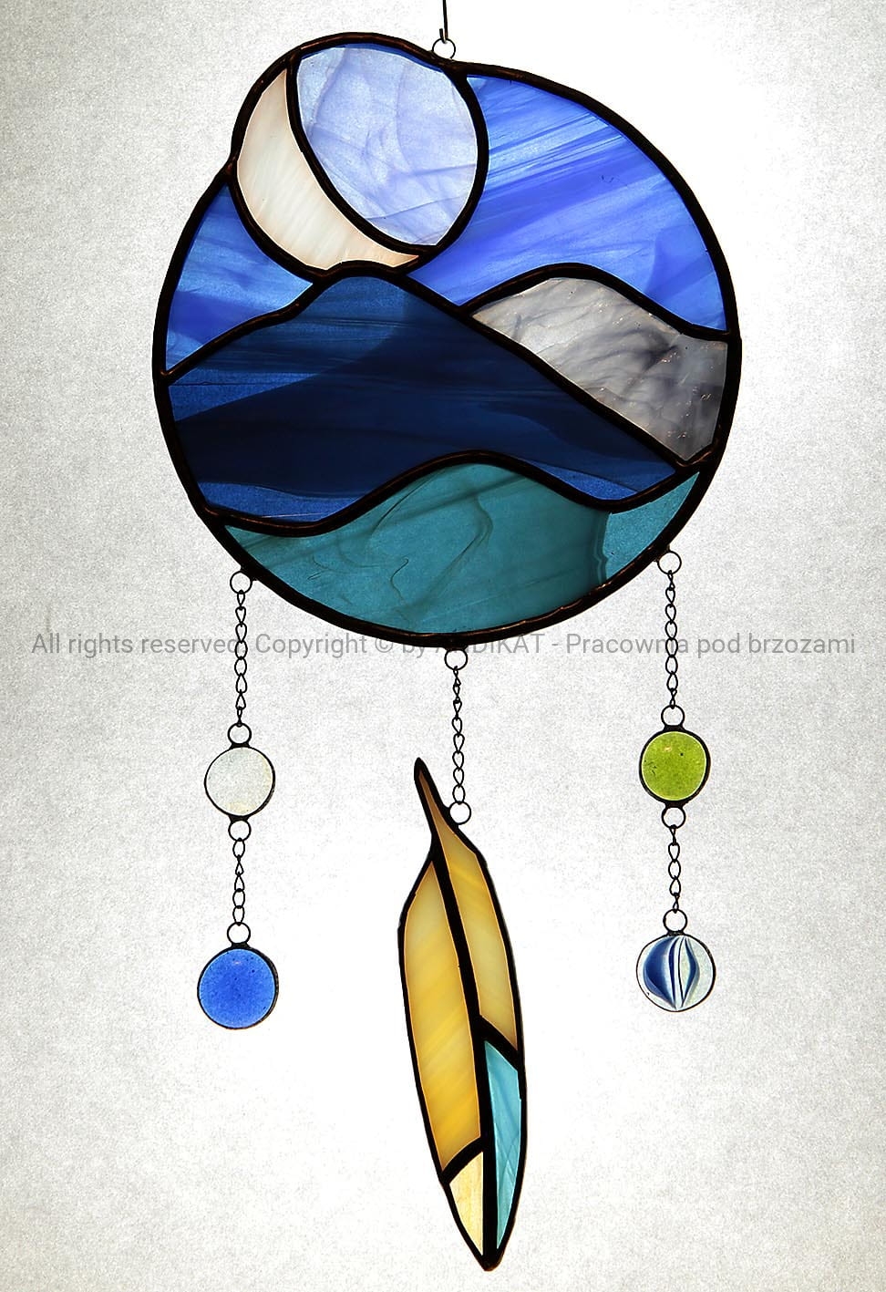 Ten łapacz wykonany jest z opalowego i katedralnego szkła witrażowego w technice tiffany.