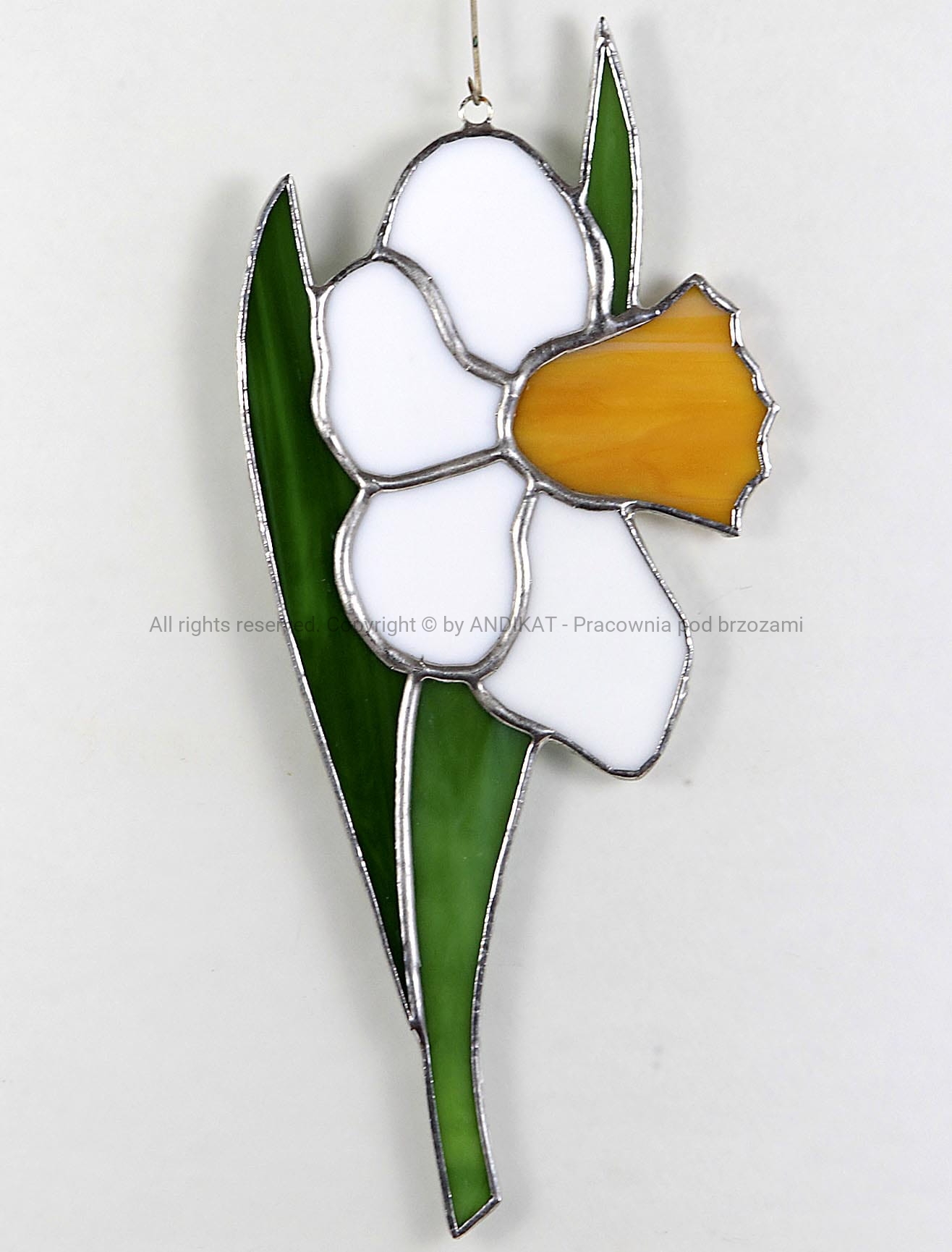 Narcyz w swej symbolice ma wiele znaczeń nie zawsze pozytywne. Jako kwiat wiosenny symbolizuje też odrodzenie i odnowienie. Chińczycy natomiast uważają, że kwiat ten symbolizuje przyszły dobrobyt i bogactwo. Ta urocza, wiosenna roślina, doda barwy wnętrzu, gdy zawieszona w oknie, uchwyci promyki słońca. Witraż wykonany w technice Tiffany ze szkła opalowego.