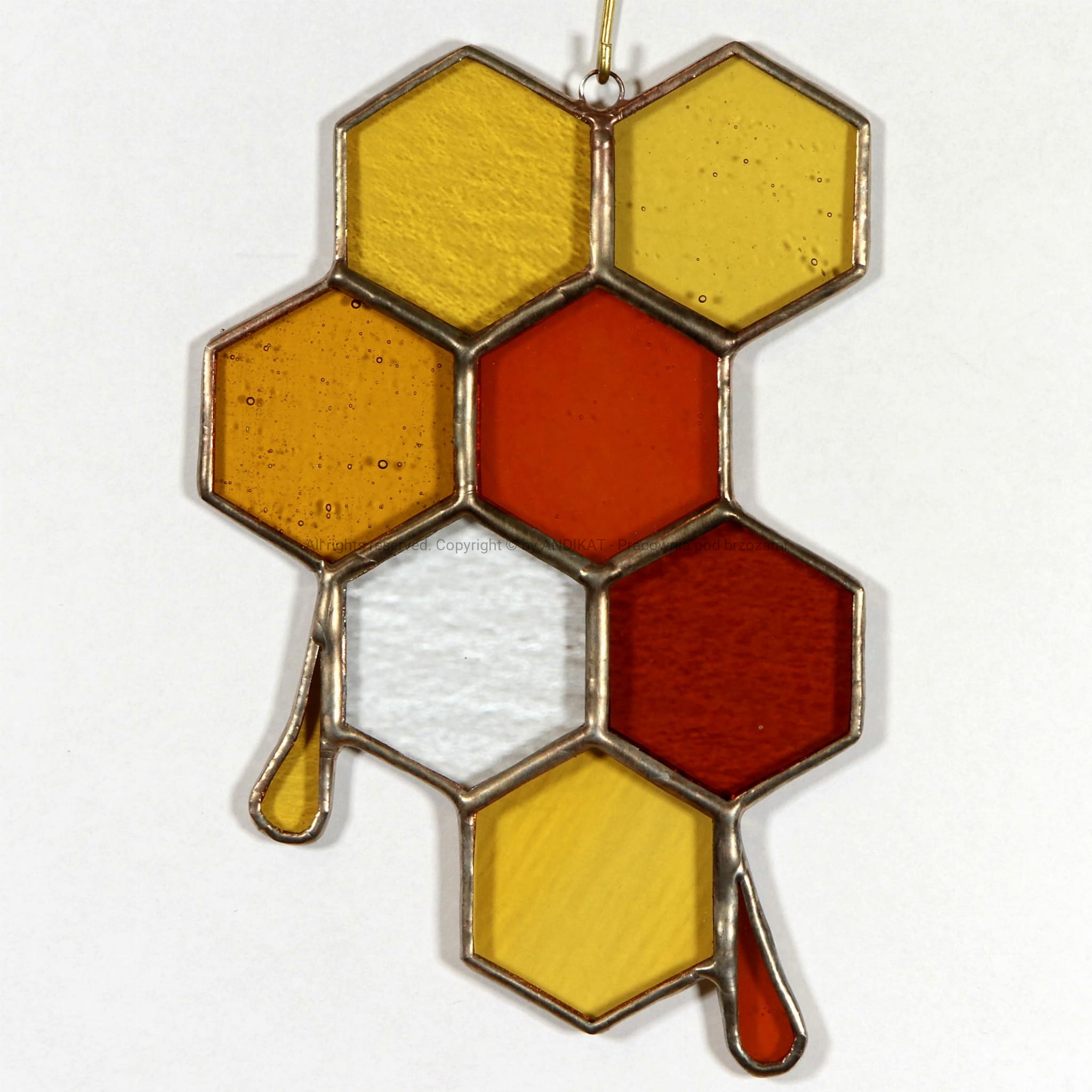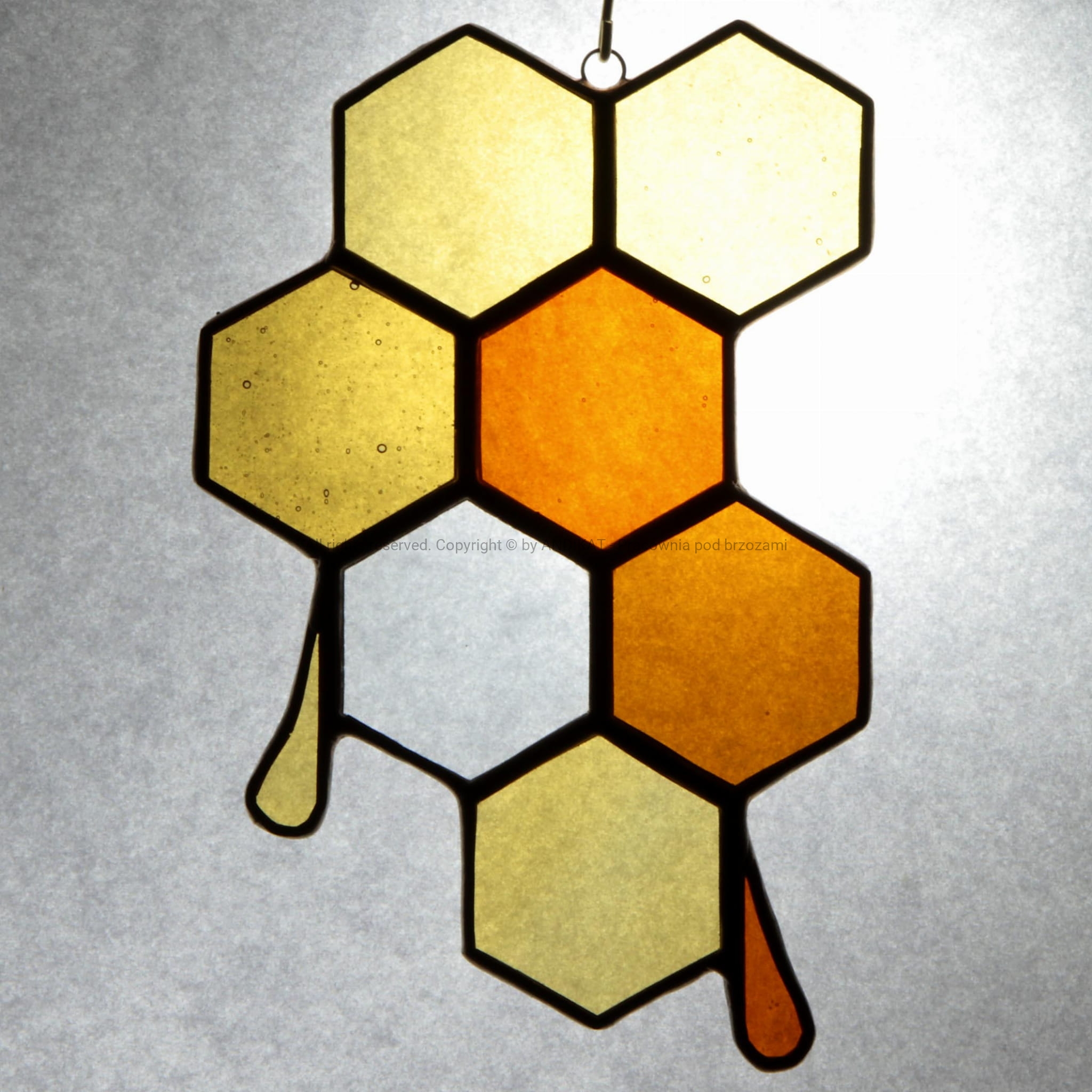 Plaster miodu jest cudem natury wykonanym przez pszczoły. Sześciokątny kształt komórek plastra pozwala pomieścić w nich maksymalną ilość miodu przy minimalnym zużyciu wosku. Ten witraż doda barwy wnętrzu, gdy zawieszony w oknie, uchwyci promyk światła. Witraż wykonany w technice Tiffany ze szkła opalowego.