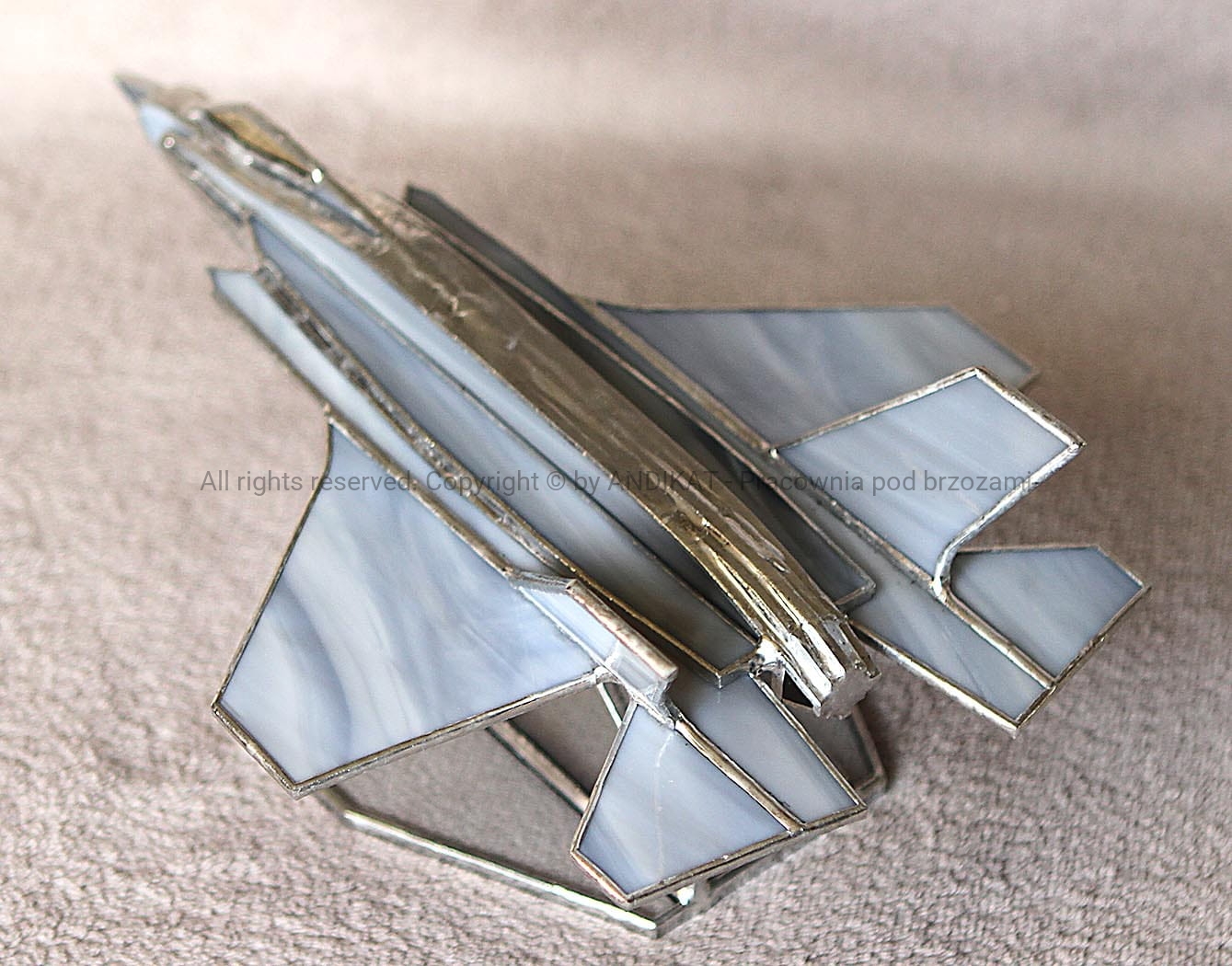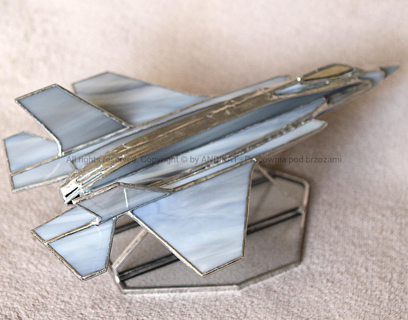 Model samolotu - F-35 Lightning - wykonany w oparciu o plany oryginalnego samolotu. Amerykański wielozadaniowy samolot myśliwski piątej generacji o obniżonej wykrywalności. Pasuje do każdego wnętrza dynamiczną sylwetką uchwyconą w locie. Na pewno miły bibelot dla pasjonatów lotnictwa. Wykonany z opalowego szkła witrażowego w technice tiffany. Na zamówienie można uzgodnić kolorystykę szkła.