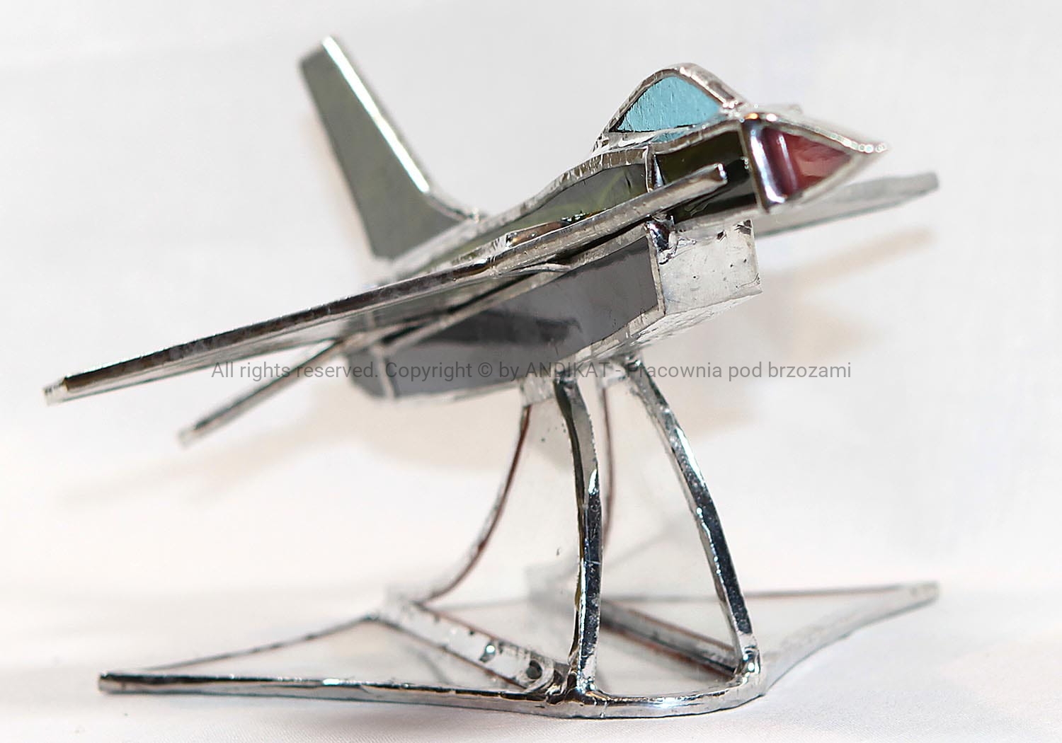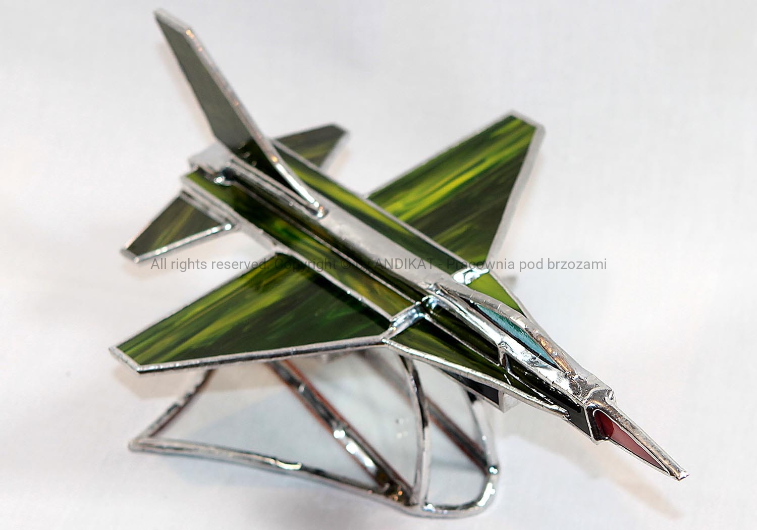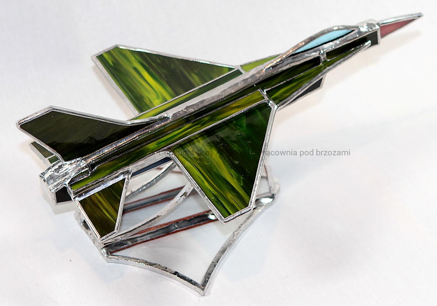 Model samolotu - F16C - wykonany w oparciu o plany oryginalnego samolotu. Samolot powstał w drugiej połowie lat 70. XX wieku w zakładach General Dynamics w USA. Używany jest też w polskim lotnictwie wojskowym od 2006 r. Pasuje do każdego wnętrza dynamiczną sylwetką uchwyconą w locie. Na pewno miły bibelot dla pasjonatów lotnictwa. Wykonany z opalowego szkła witrażowego w technice tiffany. Na zamówienie można uzgodnić kolorystykę szkła.