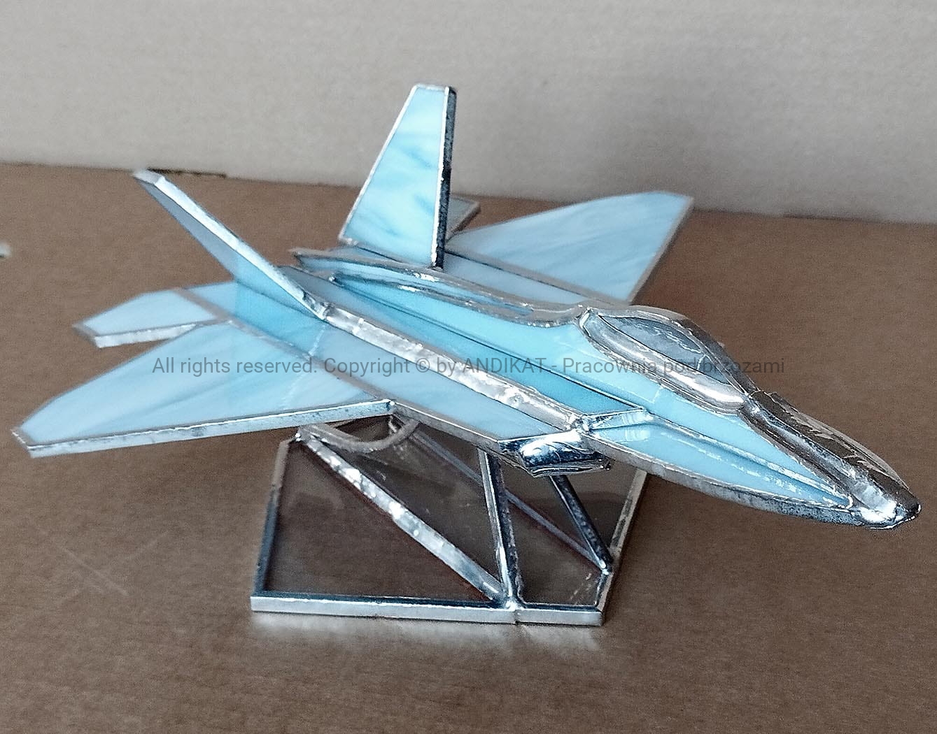 Model samolotu - F22 Raptor - wykonany w oparciu o plany oryginalnego samolotu. Amerykański myśliwiec wykonany w technologii stealth. Na wyposażenie USAF wszedł w roku 2003. Pasuje do każdego wnętrza dynamiczną sylwetką uchwyconą w locie. Na pewno miły bibelot dla pasjonatów lotnictwa. Wykonany z opalowego szkła witrażowego w technice tiffany. Na zamówienie można uzgodnić kolorystykę szkła.