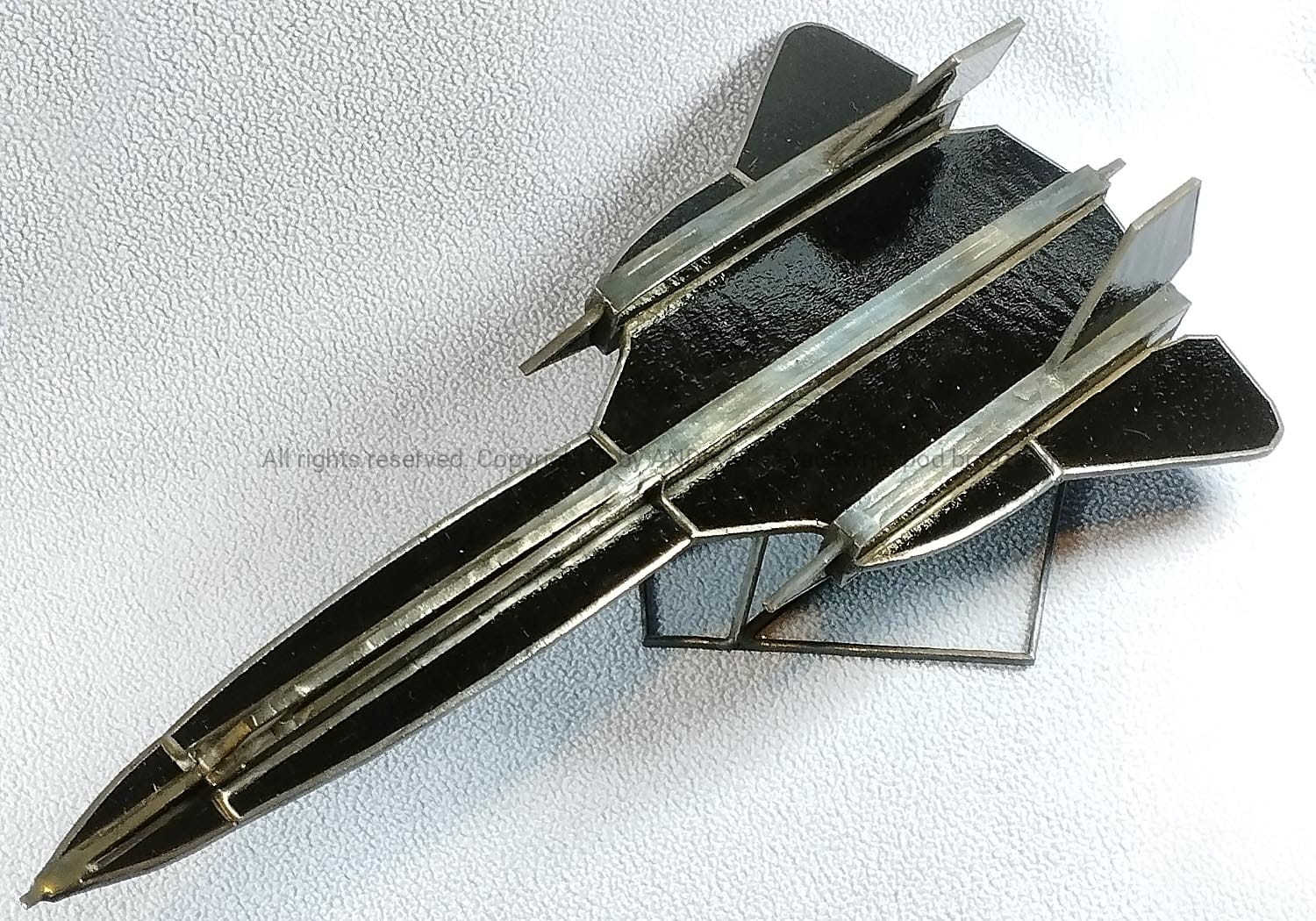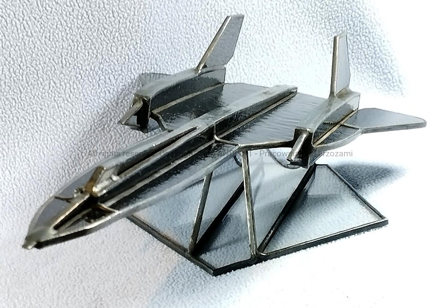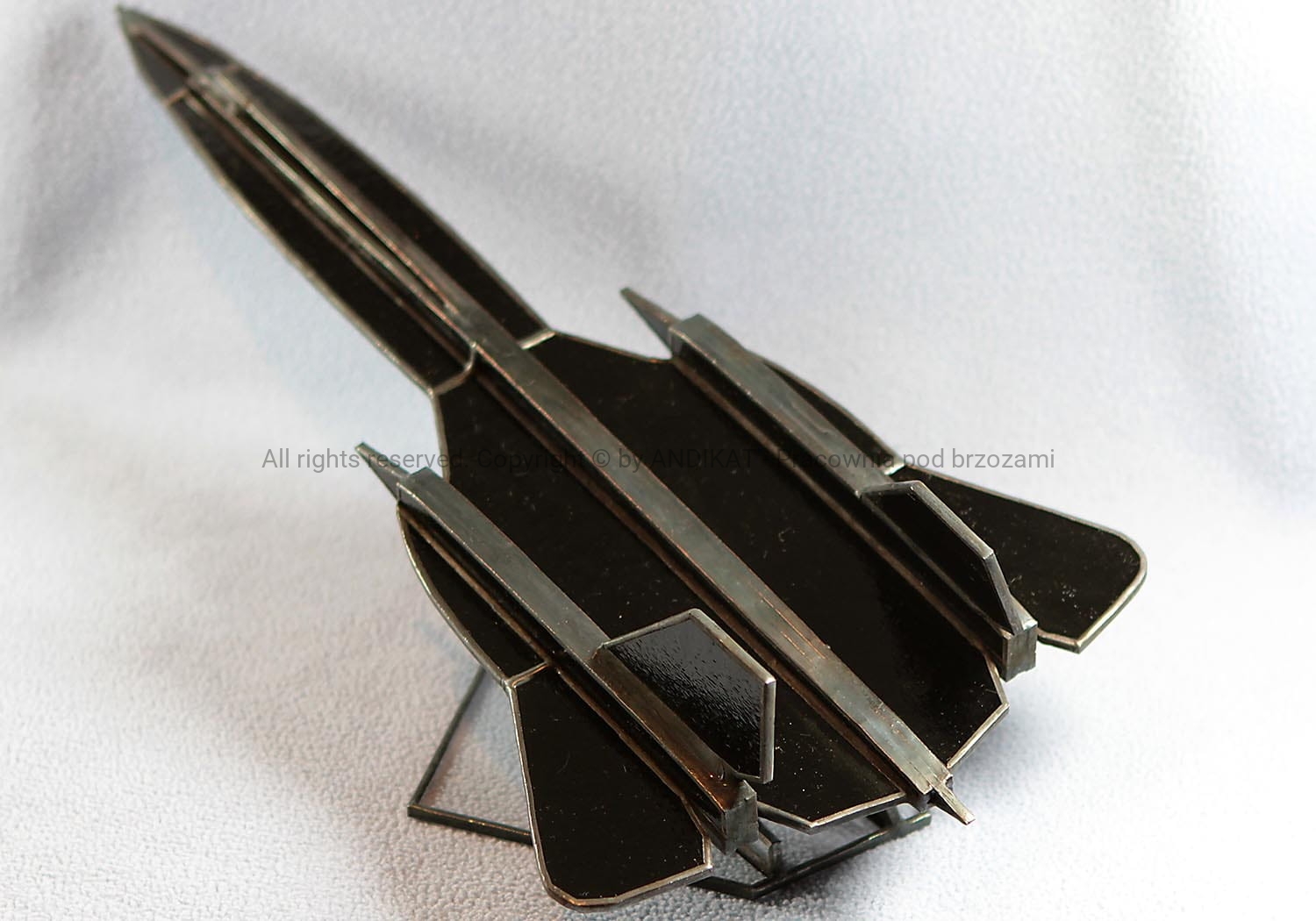 Model samolotu - Lockheed SR-71 Blackbird - wykonany w oparciu o plany oryginalnego samolotu. Samolot powstał na przełomie la 50. i 60. XX wieku w tajnym ośrodku konstrukcyjnym firmy Lockheed – ADP w Burbank k. Los Angeles. Ozdobi każde wnętrze dynamiczną sylwetką uchwyconą w locie. Na pewno miły bibelot dla pasjonatów lotnictwa. Wykonany z opalowego szkła witrażowego w technice tiffany. Na zamówienie można uzgodnić kolorystykę szkła.