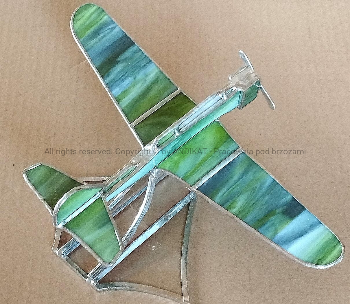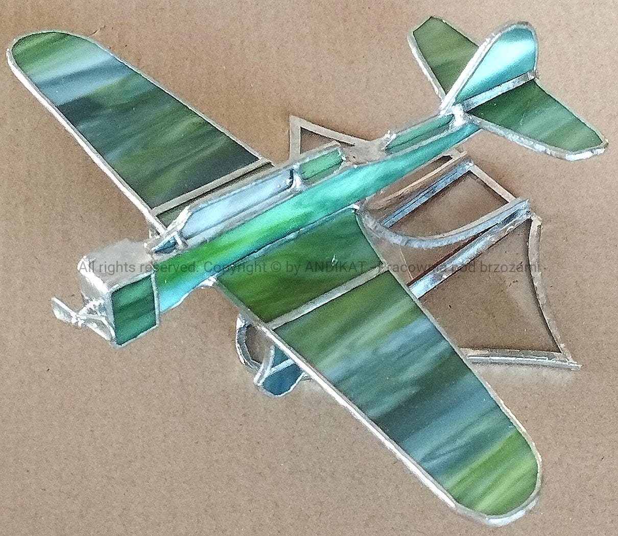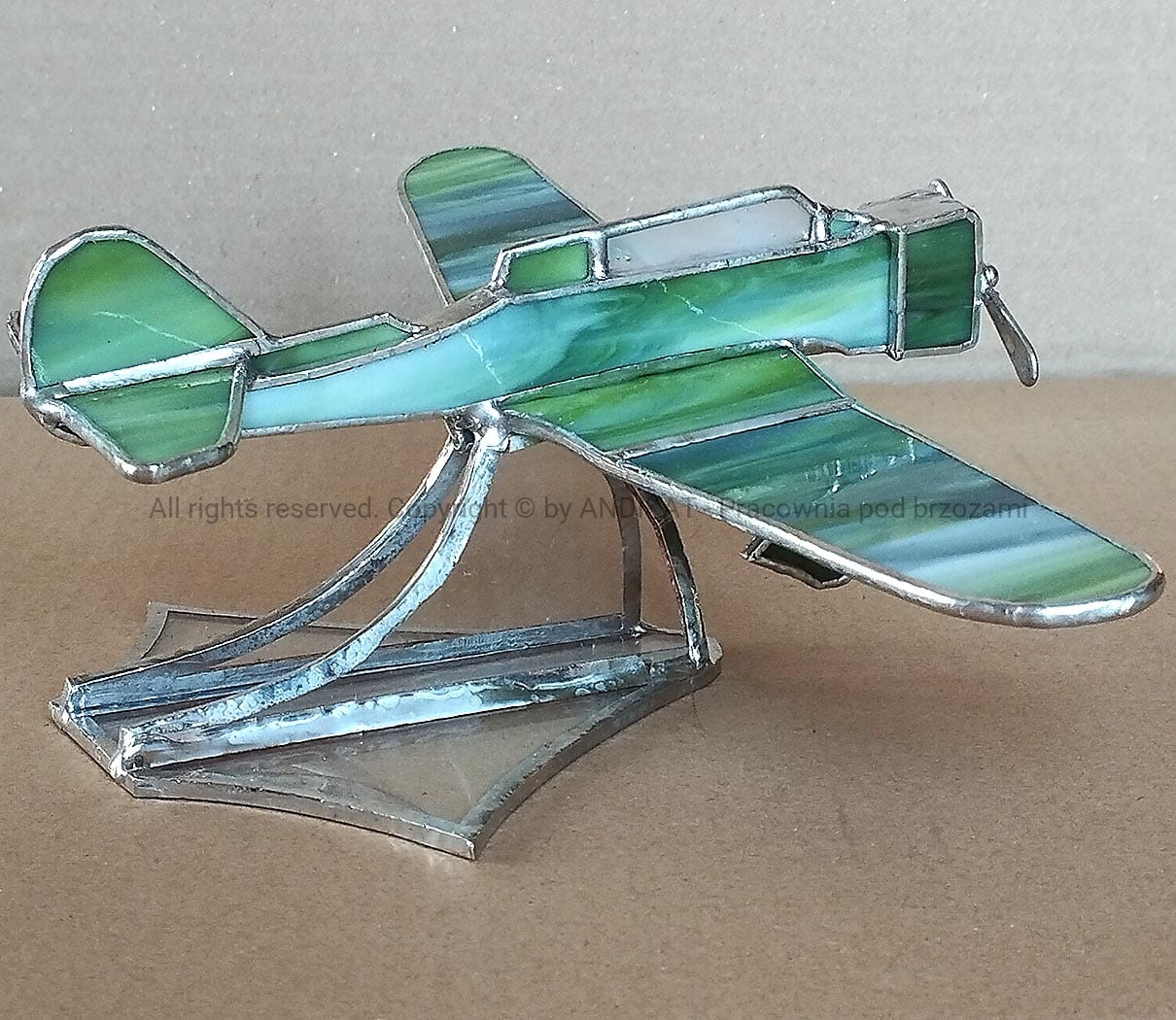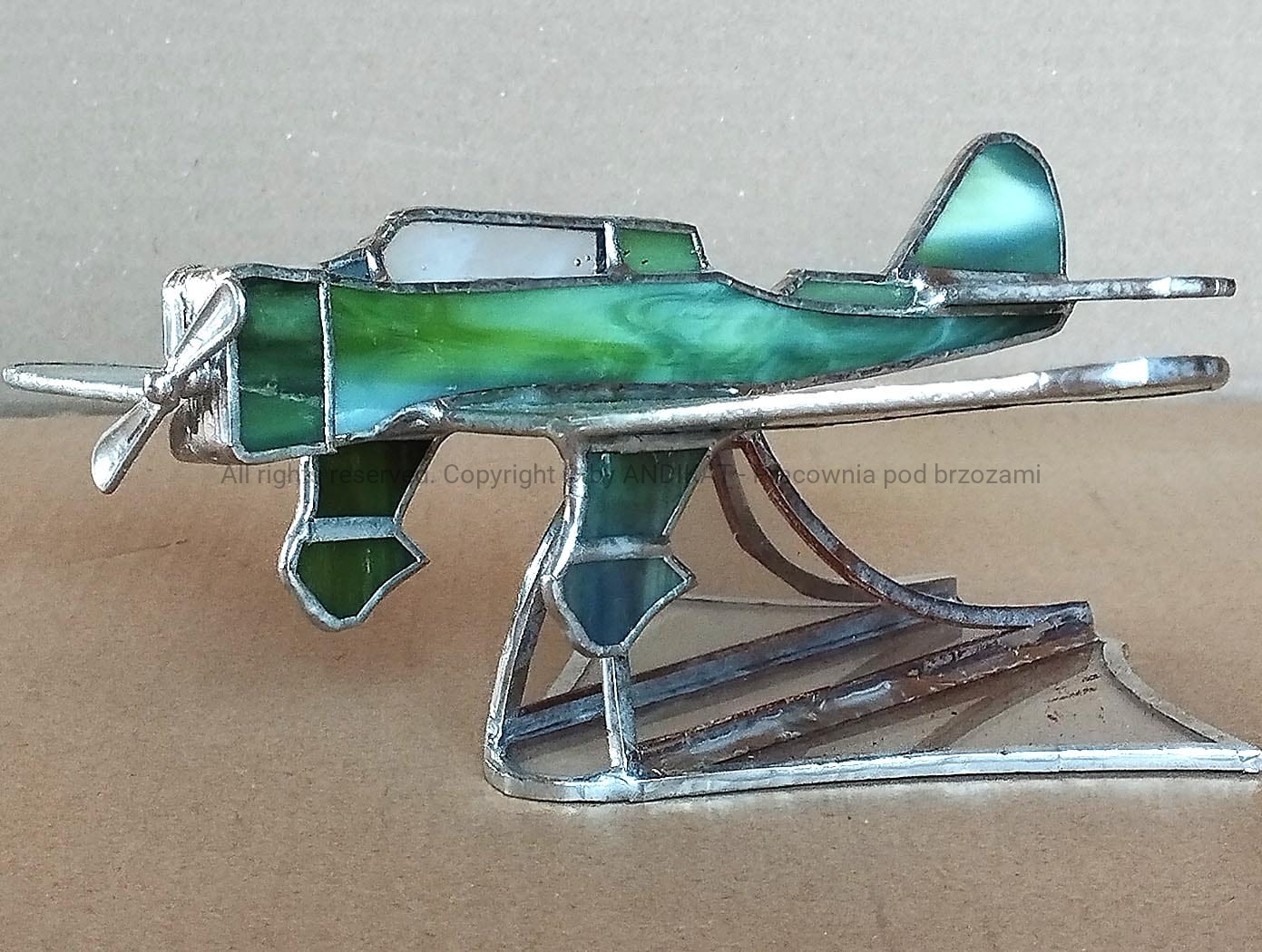Model samolotu - PZL.23 Karaś – polski lekki bombowiec i samolot rozpoznawczy, zaprojektowany na początku lat 30. XX wieku. Ozdobi każde wnętrze dynamiczną sylwetką uchwyconą w locie. Na pewno miły bibelot dla pasjonatów lotnictwa. Wykonany z opalowego szkła witrażowego w technice tiffany. Na zamówienie można uzgodnić kolorystykę szkła.