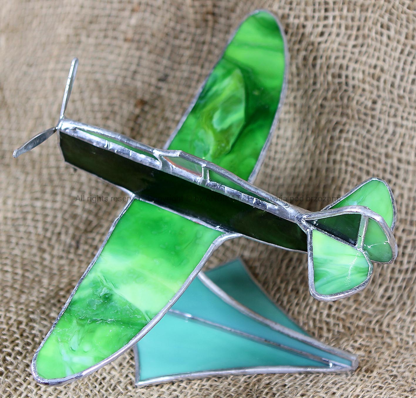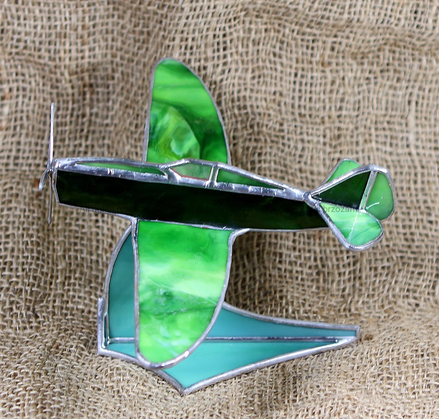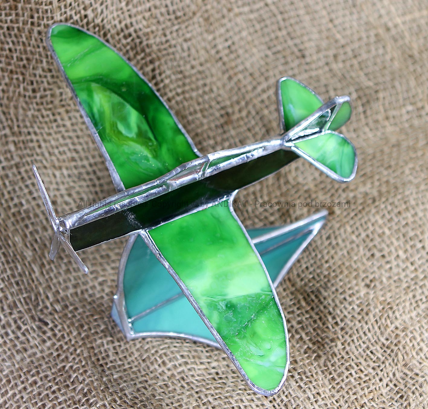 Model samolotu - myśliwca - wykonany w oparciu o plany oryginalnych samolotów. Pasuje do każdego wnętrza dynamiczną sylwetką uchwyconą w locie. Na pewno miły bibelot dla pasjonatów lotnictwa. Wykonany z opalowego szkła witrażowego w technice tiffany. Na zamówienie można uzgodnić kolorystykę szkła.