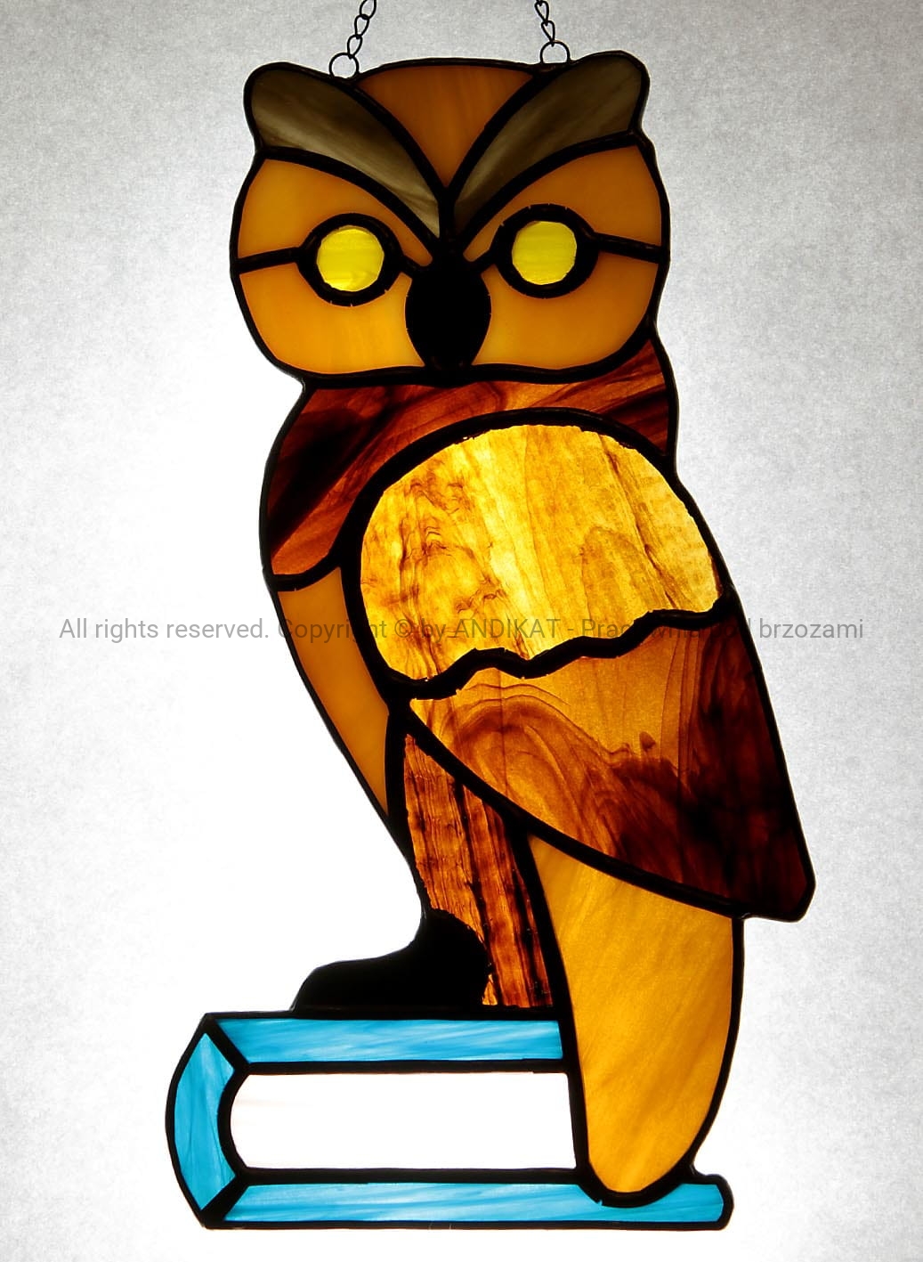 Sowa jest powszechnie znana jako symbol mądrości i wiedzy. Może być wspaniałym prezentem dla ludzi, których szanujemy i cenimy. Ten witraż doda barwy wnętrzu, gdy zawieszony w oknie, uchwyci promyk światła. Witraż wykonany w technice Tiffany ze szkła opalowego.