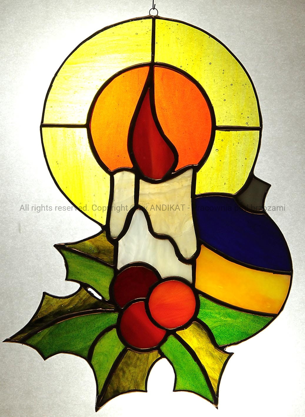 Stroik świąteczny wykonany w technice tiffany z opalowego szkła witrażowego. Dekoracja przydająca blasku świątecznym chwilom spędzonym w kręgu najbliższych. Pięknie prezentuje się zawieszony w oknie.