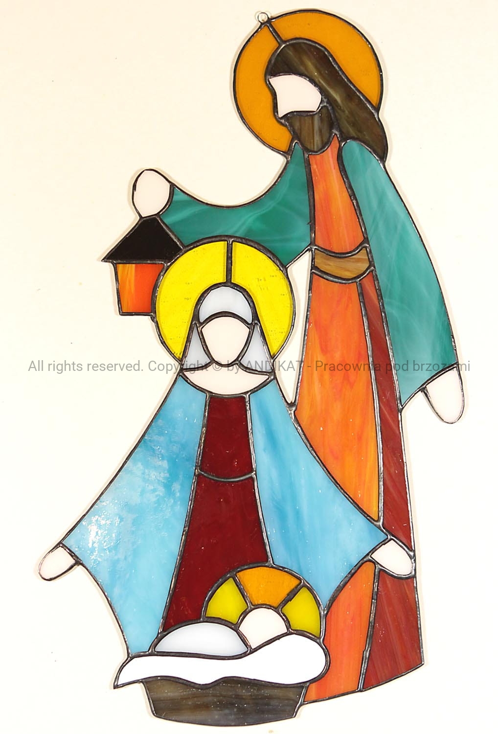 Witraż przedstawiający Świętą Rodzinę z Nazaretu. Rodzice z czułością i troską otaczają Bożą Dzieciną. Witraż, wykonany z opalowego szkła witrażowego, pięknie świeci kolorami zawieszony w oknie. Równie pięknie prezentuje się na jasnej ścianie.
