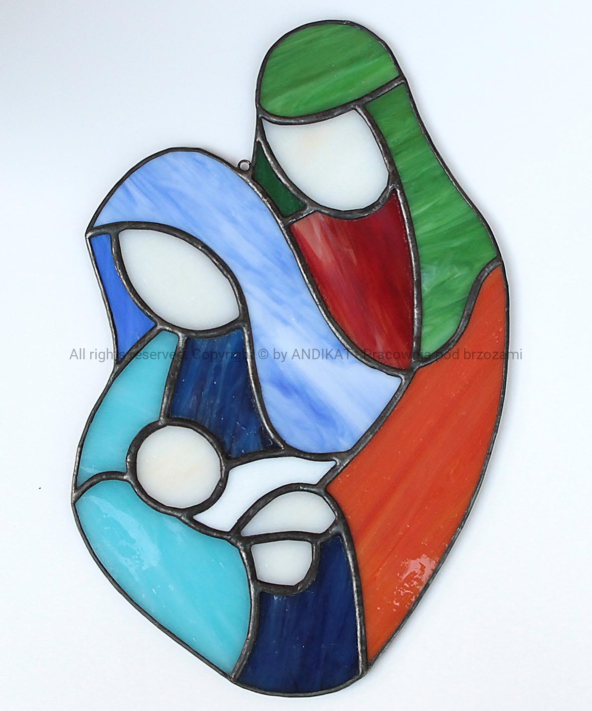 Witraż przedstawiający Świętą Rodzinę z Nazaretu. Rodzice z czułością i troską otaczają Bożą Dzieciną. Witraż, wykonany z opalowego szkła witrażowego, pięknie świeci kolorami zawieszony w oknie. Równie pięknie prezentuje się na jasnej ścianie.