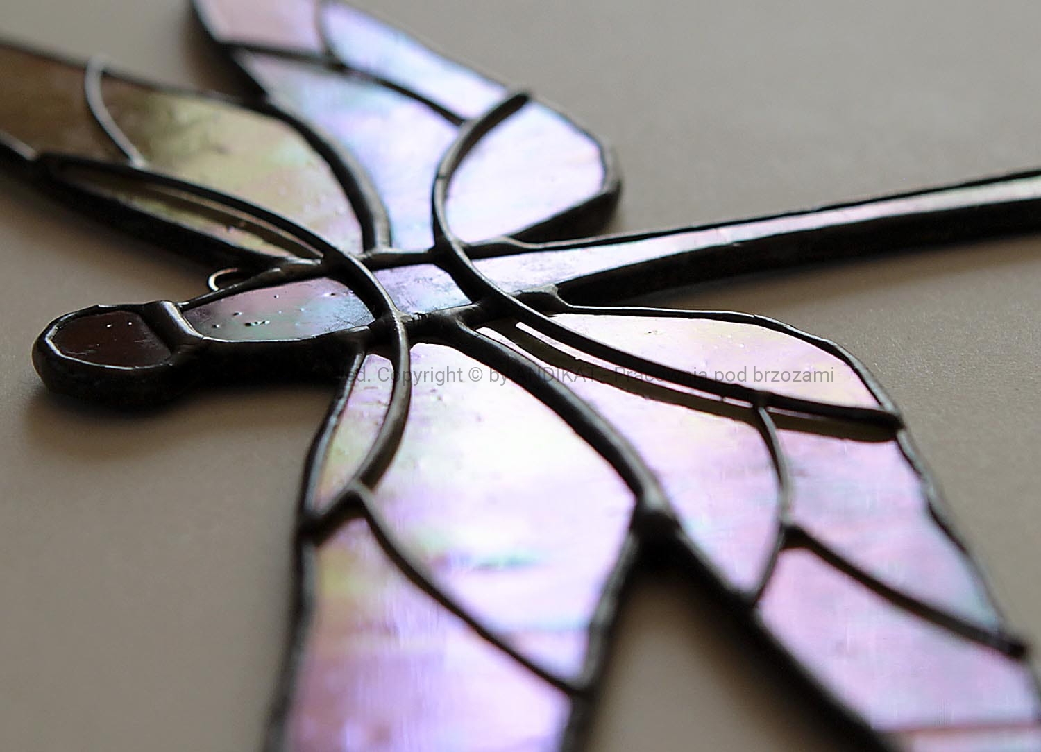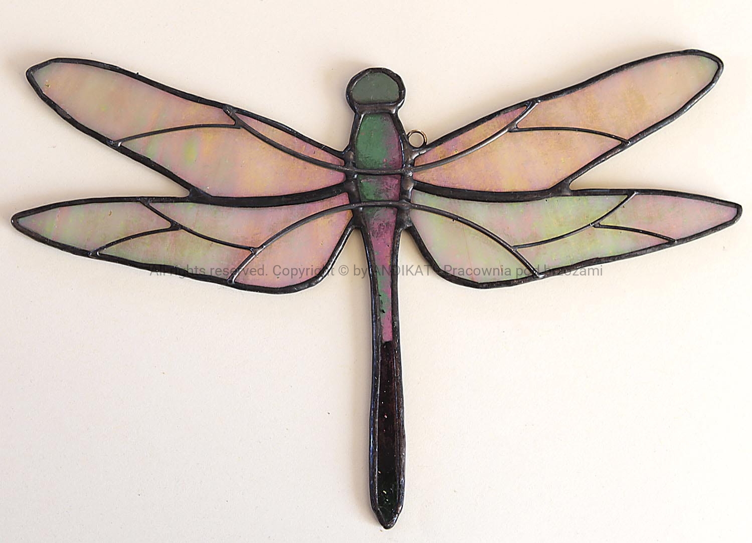 Ważki zawsze wzbudzają w nas zachwyt swoją delikatnością i zwiewnością. Symbolizuje radość, aktywność i zmianę, a w niektórych kulturach nieśmiertelność. Ta ważka doda barwy każdemu wnętrzu, gdy zawieszona w oknie, uchwyci promyk światła. Wykonany w technice Tiffany ze szkła opalowego iryzowanego.