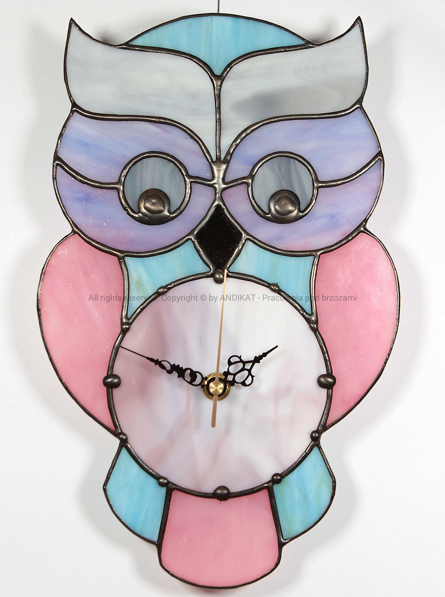 Piękny i oryginalny zegar wiszący, który pasuje do każdego wnętrza. Zegar wpisany w postać sowy - symbolu mądrości. Wykonany ręcznie, według własnego projektu, z opalowego szkła witrażowego w technice tiffany. Posiada bardzo cichy mechanizm z płynącym sekundnikiem. Na zamówienie można uzgodnić kolorystykę szkła.