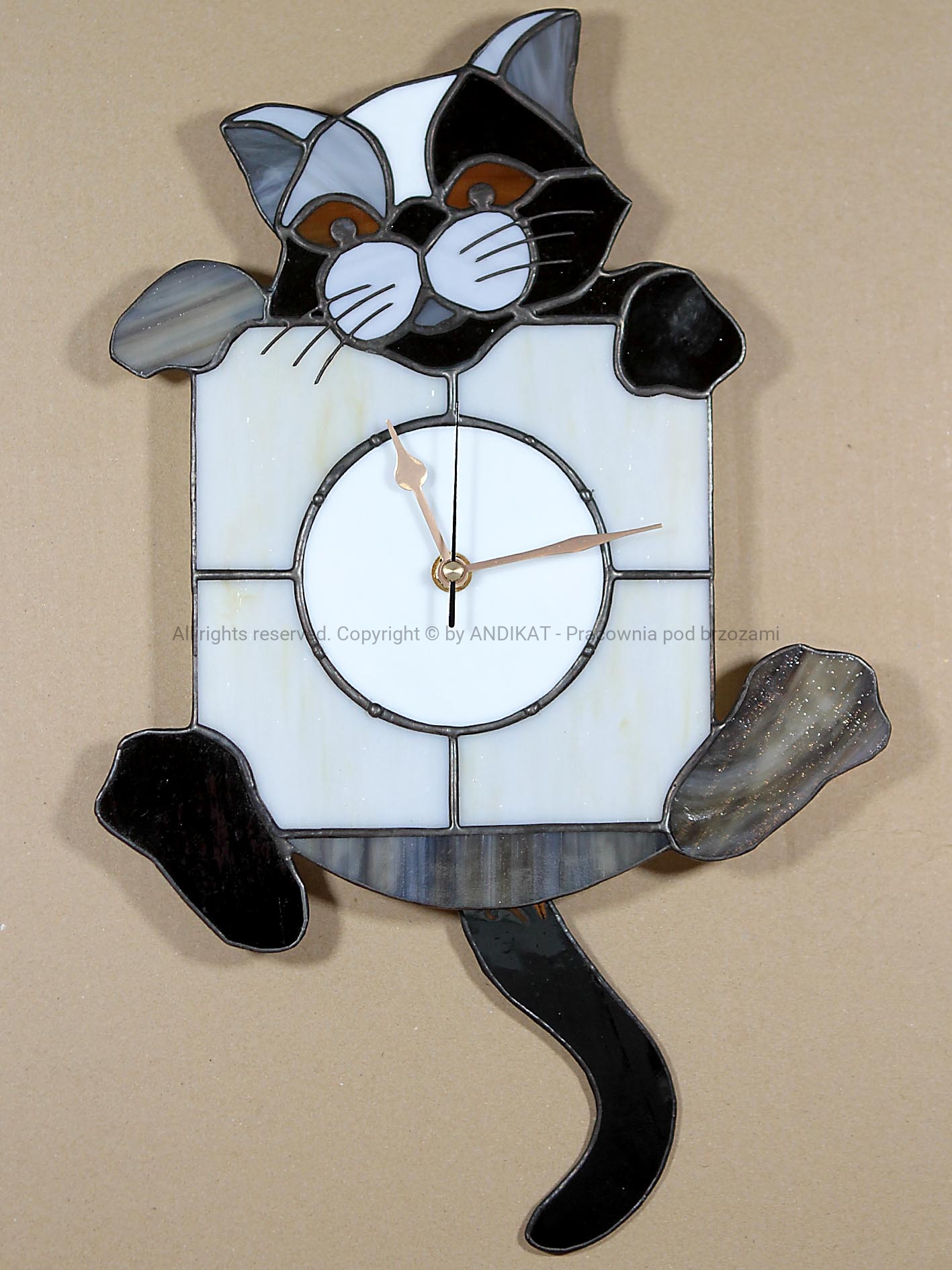 Piękny i oryginalny zegar wiszący, który pasuje do każdego wnętrza. Tarcza zegara trzymana przez kota machającego figlarnie ogonem. Wykonany ręcznie, według własnego projektu w technice tiffany. Posiada mechanizm kwarcowy z wahadłem. Na zamówienie można uzgodnić kolorystykę szkła.