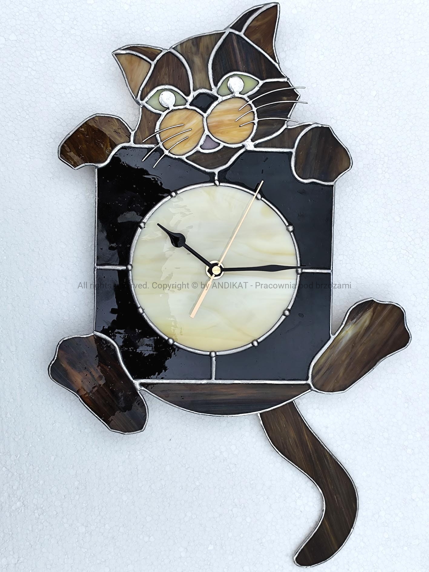 Piękny i oryginalny zegar wiszący, który pasuje do każdego wnętrza. Tarcza zegara trzymana przez kota machającego figlarnie ogonem. Wykonany ręcznie, według własnego projektu w technice tiffany. Posiada mechanizm kwarcowy z wahadłem. Na zamówienie można uzgodnić kolorystykę szkła.
