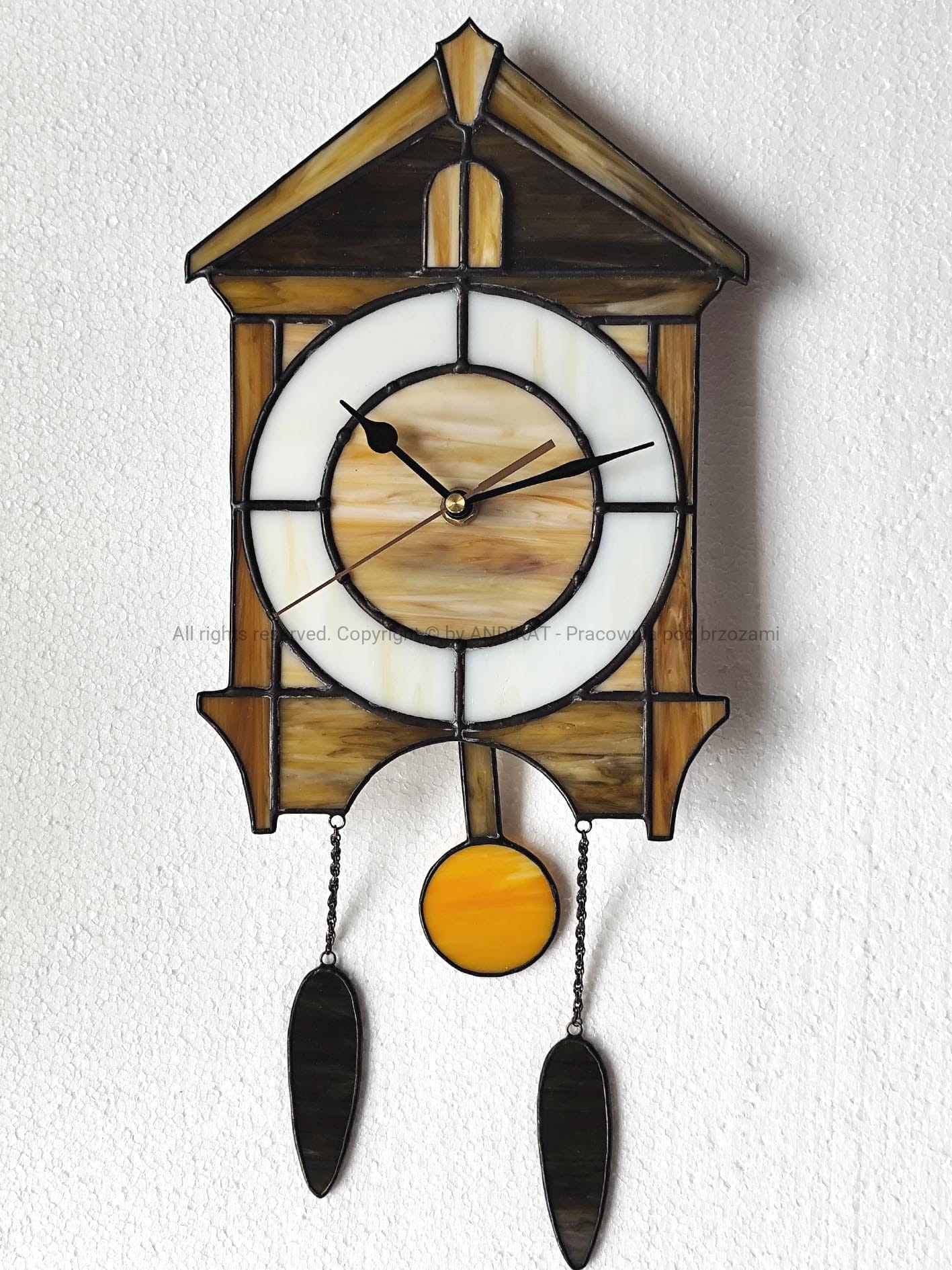 Piękny i oryginalny zegar wiszący, który pasuje do każdego wnętrza. Wzorowany na tradycyjnych zegarach wiszących z kukułką (ale bez kukułki). Wykonany ręcznie, według własnego projektu w technice tiffany. Posiada mechanizm kwarcowy z wahadłem. Na zamówienie można uzgodnić kolorystykę szkła.